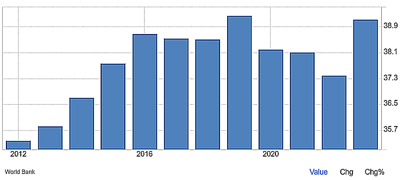 중국의 민간소비(GDP 대비) 비중은 2010년대 초반 최저점(30%대 중반)을 지나 조금씩 오르고 있지만, 2023년에도 약 39% 수준에 그쳤습니다.