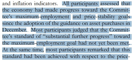 모든 참여자들(All participants)은 지난 12월에 위원회가 자산 매입 가이던스를 채택한 이후로, 미국 경제가 완전고용(maximum-employment)과 물가안정(price-stability) 목표를 향한 진보를 달성했다고 평가했다.