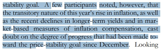 그러나 소수의 참여자(a few participatns)들은 최근 일시적인 인플레이션 상승과 장기금리의 하락을 봤을 때, 물가안정 목표를 향한 진전에도 의구심을 던졌다.