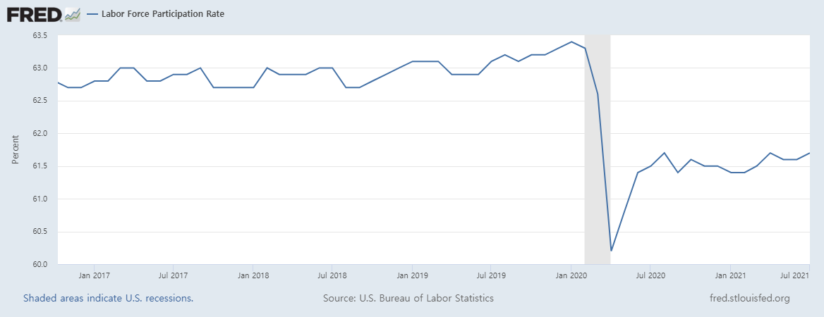 현재 경제활동참가율은 코로나19 이전과 비교할 때, 좀처럼 회복되는 모습을 보이지 않고 있습니다. 이는 연준의 통화정책 긴축을 주저하게 만드는 결정적인 요소라고 생각됩니다.