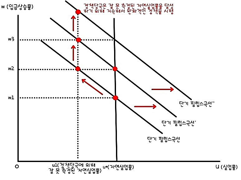 '장기적'으로 근로자들은 인플레이션을 인지하게 되고,기대인플레이션의 상승(단기 필립스곡선의 우측 이동)과 함께 기업에게 임금 상승을 요구하게 됩니다. 이는 인플레이션 상승으로 이어지게 됩니다. 실업률은 자연실업률로 돌아가게 됩니다(u*, w2).