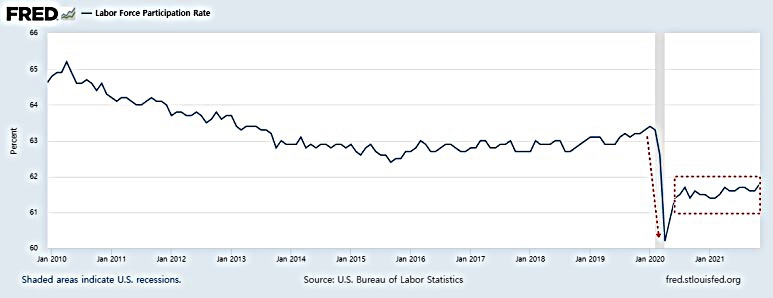 2020년 2월 이후, 미국의 경제활동참가율은 큰 폭으로 떨어졌으며 현재까지 좀처럼 회복되지 않고 있습니다. 경제활동참가율의 회복 향방은 경제학자들 사이에서도 의견이 매우 분분한 상황입니다.