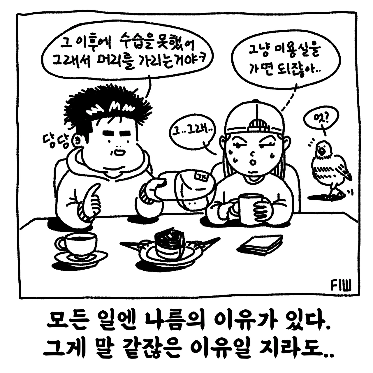 가만히 생각해보니 어린 시절부터 유난히 많았던 머리숱에 대한 콤플렉스와 미용실에 가는 것에 대한 부담 때문이었던 것 같습니다. 이 글을 읽으시는 여러분도 본인만의 패션 철학(?)이 있으신가요? 때론 이해하기 어려운 어떤 고집에도 나름의 이유가 있지 않을까 생각해봅니다.