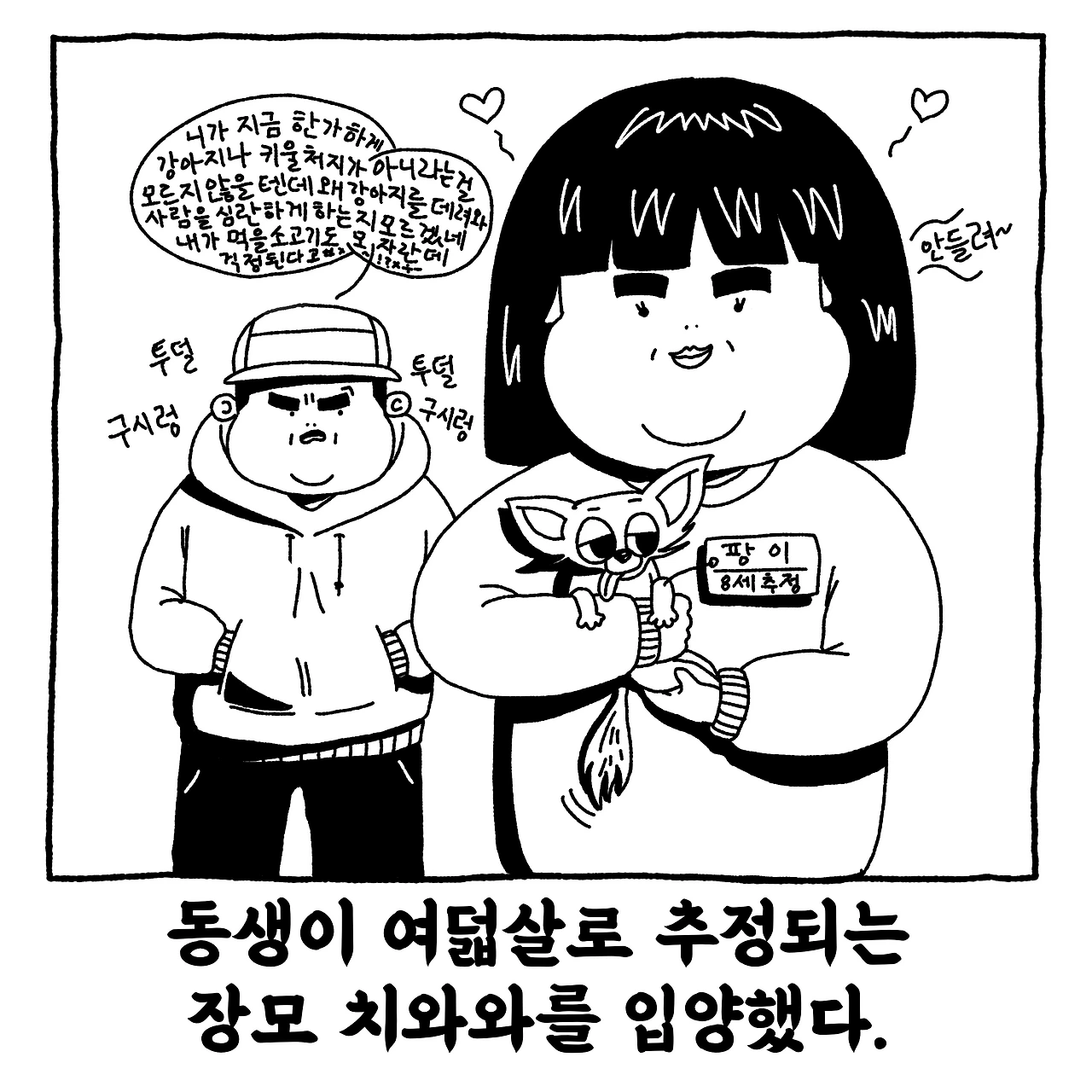 동생이 유기견인 장모 치와와를 덜컥 입양했습니다. 강아지, 고양이를 너무 좋아하고 예뻐하지만 가족이 된다는 것은 전혀 다른 문제였죠. 생명은 너무나도 소중한 것이기에 책임의 무게가 사람을 입양하는 것만큼 무겁다고 생각했기 때문입니다. 하지만 손쓸 새도 없이 가족이 되어버렸고 이미 상처가 있는 아이를 다시 돌려보낼 수도 없기에 받아들이기로 했습니다. 물론 전 분가해서 살고 있기에 사실상 직접 키우는 건 아니지만요. 형편도 넉넉지 않고 어머니는 뇌출혈 후유증으로 편마비를 앓고 계시기 때문에 집 분위기가 밝지는 않았습니다. 하지만 이 강아지 한 마리가 들어온 뒤 눈에 띄게 밝아지신 부모님을 보니 마음이 조금 누그러들게 되었습니다.