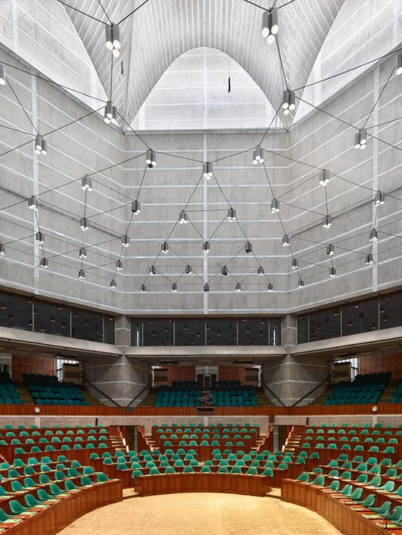 다카에는 많이 갔었지만 이 건축물에 방문할 기회는 딱 한 번 있었는데 거대하고 압도적인 형태를 가진 콘크리트 건물이 마치 물 위에 떠 있는 것 같은 가벼움과 웅장함을 동시에 보여주는 외관을 갖고 있었다. 현실에는 존재하지 않을 것만같은 건축적 이상을 구현해 낸 루이스칸의 집념이 보였다. 내부에는 현대 다카에서도 볼 수 없는 모더니즘 시대의 가구와 전등 등이 장식되어 있다. 방글라데시에서 구한 듯한 것은 찾을 수 없었고 모든 가구와 부자재를 유럽과 미국에서 실어 날랐다는 이야기에 기함을 금치 못했다. 내부공간은 상당한 역동성이 있어서 외부와 내부가 소통하는 공간과 루이스칸의 건물답게 빛이 벽의 형태와 시간의 변화에 따라 역동적으로 변화하는 모습을 볼 수 있다. 개인적으로 가장 인상깊었던 공간은 의원들의 회의 공간으로 천창을 통해 빛이 가득 떨어졌고 야간의 회의를 위해 허공에 달린 전등은 얇은 줄에 매달려 낮 동안의 공간으로의 빛의 소통을 막지 못하게 했다.