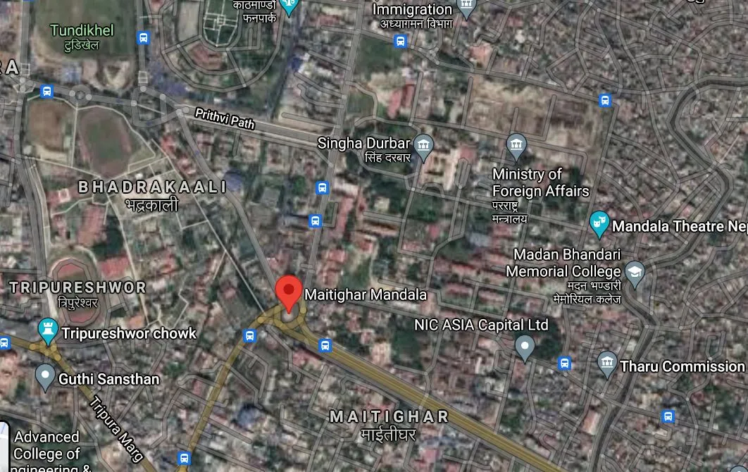 기사에 자주 등장하던 저곳은 여러 가지 꽃들로 수놓아진 커다란 문양이 있는 로터리인데, 사람의 눈높이에서는 잘 보이지 않지만 건물 위에서나 드론으로 찍은 사진을 보면 그 문양이 만다라 모양을 갖고 있다는 걸 알 수 있다. 이곳은 "마이티가르만다라(Maitigar Mandala)"라고 불리는 곳으로 최근 십수 년 동안 네팔의 국가적 상징으로 부상한 곳이기도 하다. 계획상으로는 공원으로 조성해 놓기는 했는데 카트만두의 세 개의 주요 도로이자 통행량도 많은 도로의 로터리에 위치하고 있어 무단횡단을 하지 않고는 사실 공원에 들어가기는 어렵다.