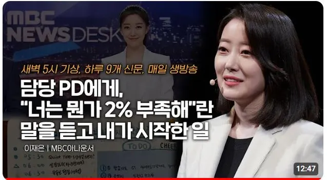 구체적인 설명도 없이 던져진 이 말에 이재은 아나운서는 상처를 받았고 한 동안 '나는 모든 일에 부족하고 뭘 해도 안될 사람'이라는 부정적 생각에 사로잡혀 힘든 시간을 보냈다고 한다. 다행히 시간이 지나면서 그녀의 꾸준함을 알아보고 응원해 준 사람들이 생겼고 지금 이렇게 제 몫을 근사하게 해내는 아나운서가 되었다. (무려 9시 뉴스데스크의 앵커가 아니던가.)