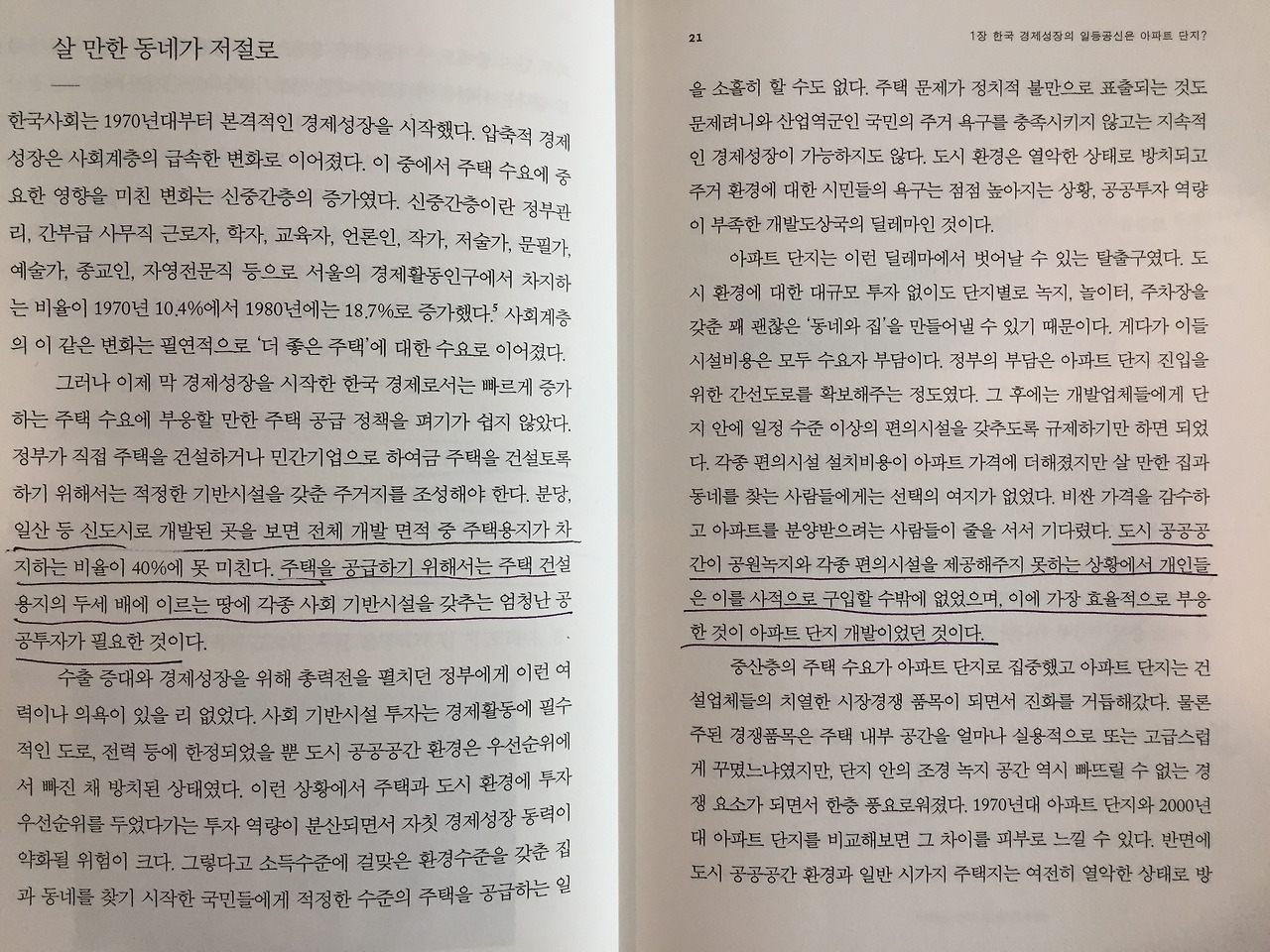 "도시 공공공간이 공원녹지와 각종 편의시설을 제공해주지 못하는 상황에서 개인들은 이를 사적으로 구입할 수밖에 없었으며, 이에 가장 효율적으로 부응한 것이 아파트 단지 개발이었던 것이다." P.21