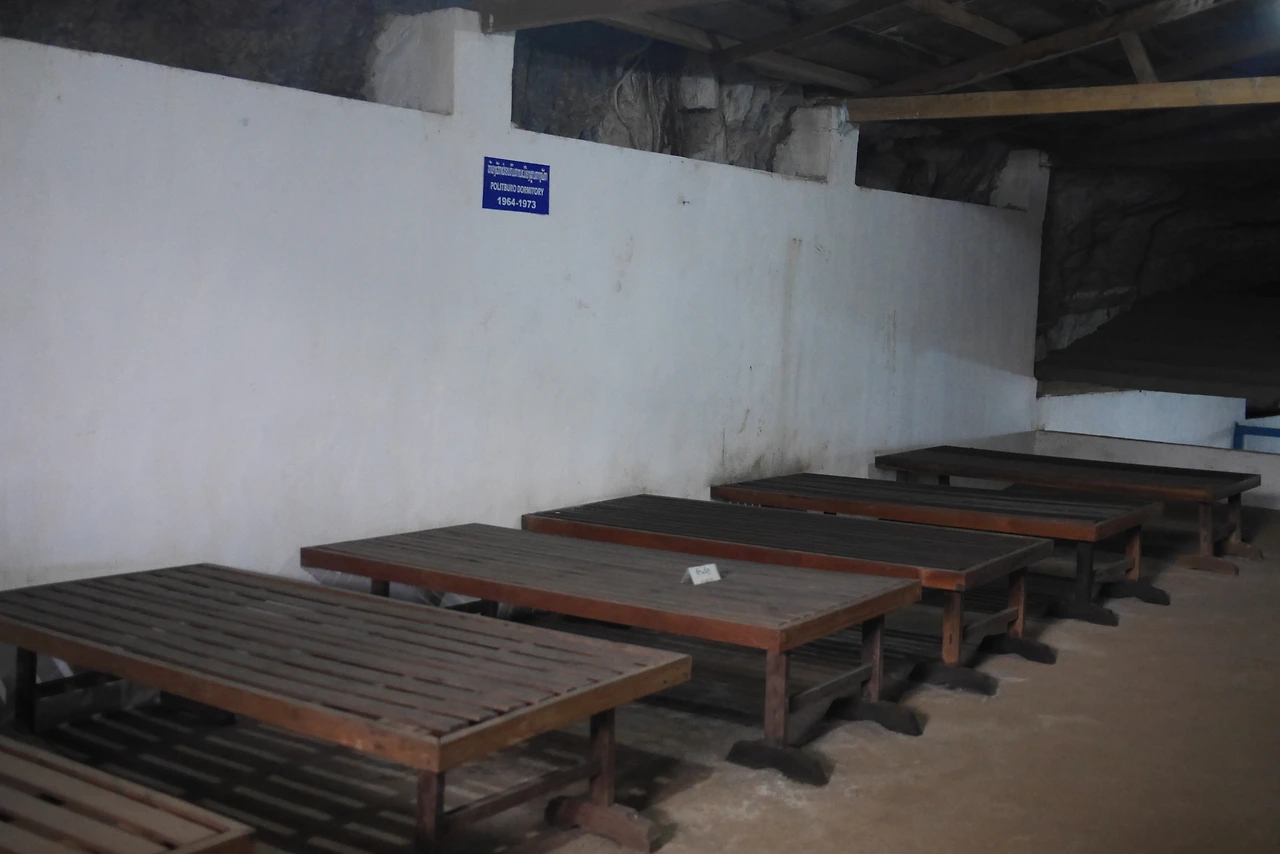 여기는 유난히 동굴이 많다. 그러나 이 동굴들은 단순한 자연의 산물이 아니다. 비엥싸이 동굴을 이야기할 때 빼놓을 수 없는 이름이 바로 빠뗏 라오(Pathet Lao)다. 간단히 말하면, 1960~70년대 라오스의 공산주의 혁명 세력이다. 당시 라오스는 내전 중이었고, 빠떼 라오는 북부와 동북부 지역을 중심으로 군사 활동과 정치 활동을 하며 권력을 확장했다. 특히 비엥싸이 동굴은 그들의 본부 겸 지하 도시 역할을 했다. 주민들과 전투 요원들이 폭격과 공격을 피하면서 생활하고, 학교와 병원, 극장, 심지어 상점까지 운영했던 곳이다. 쉽게 말해, 단순한 ‘숨는 곳’이 아니라 사람들이 살아가던 작은 마을 같은 지하 공간이었다. 회의를 위한 큰 방, 환자를 치료하기 위한 병원, 음식을 보관하던 창구 등 당시의 모습을 생생하게 볼 수 있다. 총기, 의자 등 그때 사용하던 물품 등도 그대로 전시하고 있어서 좁은 통로를 지나다 보면 “이곳에서 사람들은 어떻게 생활했을까, 당시에는 전기도 거의 없었을 텐데” 하고 생각하게 된다.