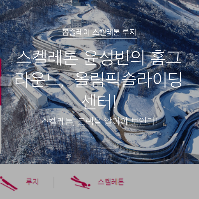 스켈레톤 종목은 대한민국의 윤성빈 선수가 남자 싱글 세계랭킹 1위입니다. 이번 올림픽에서 많은 분들이 관심을 가지게 될 종목 중 하나라고 생각합니다.
