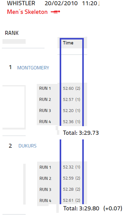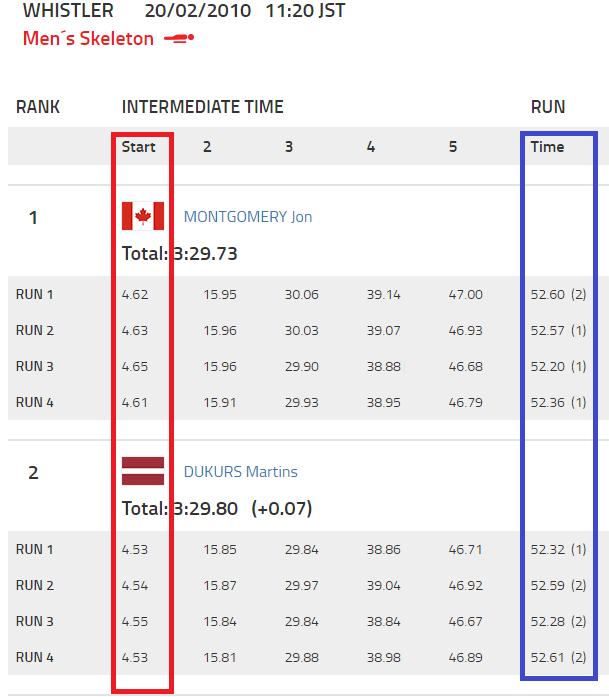 우선 스켈레톤은 4번 주행의 기록을 합산하는 것이기 때문에 주행하는 장면이 네 번 나오는 것을 알 수 있습니다. 그리고 이 경기는 최종 “0.07초(무려!)” 차이로 몽고메리(오른쪽)가 두커스(왼쪽)를 누르고 금메달을 차지했습니다. 2010년 뱅쿠버 올림픽 스켈레톤 남자싱글 결과지입니다. 빨간색은 스타트기록, 파란색은 Run별 주행기록을 나타냅니다. Run1~Run4의 4번 주행기록이 기록되었습니다. 그리고 네번의 주행기록을 합산한 값으로 메달을 정합니다.