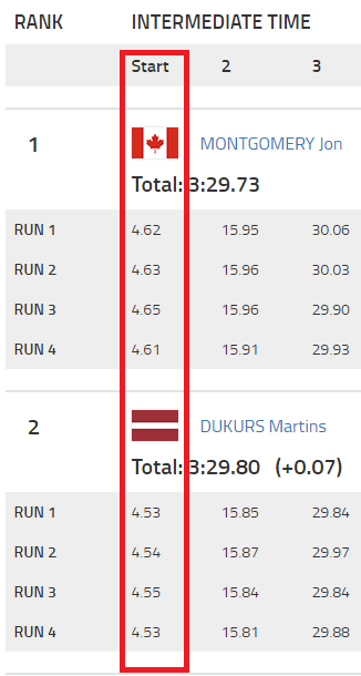 스타트(Start)기록은 모두 두커스(영상에서 왼쪽;Dukurs Martins)가 좋았습니다. 아래 그림에서 빨간색 부분을 봐주세요! Run1(1차주행)에서 두커스(왼쪽)는 4.53초, 몽고메리(오른쪽)는 4.62초. Run2(2차주행)에서 두커스는 4.54초, 몽고메리는 4.63초. Run3(3차주행)에서 두커스는 4.55초, 몽고메리는 4.65초, Run4(4차주행)에서 두커스는 4.53초, 몽고메리는 4.61초를 기록해서 모두 두커스가 스타트기록이 앞섭니다.