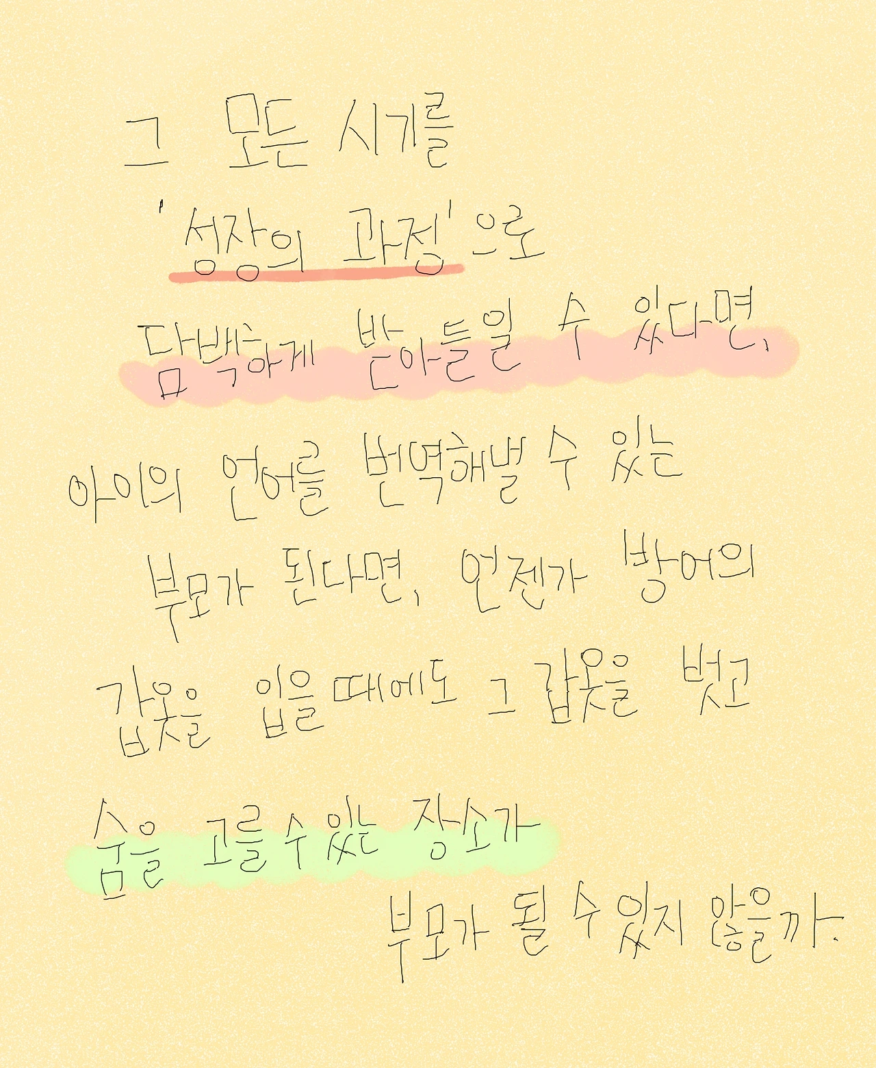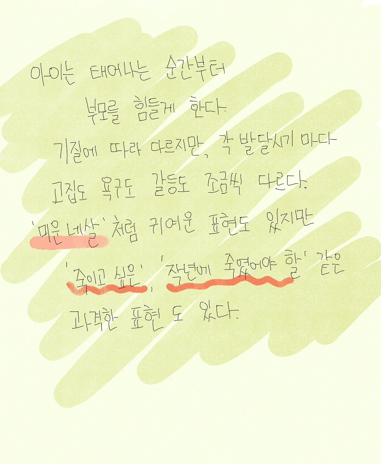 예능을 잘 챙겨보는 편은 아니지만 〈금쪽같은 내 새끼〉를 꼭 챙겨보는 이유도 같은 일환입니다. 특히 사춘기 자녀가 나오는 회차는 유심히 분석해 봐요. 어떤 지점에서 부모와 아이의 관계가 엇갈리기 시작하는지를 파악해 보곤 합니다.