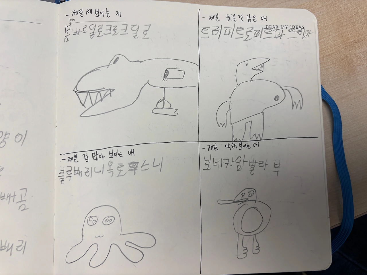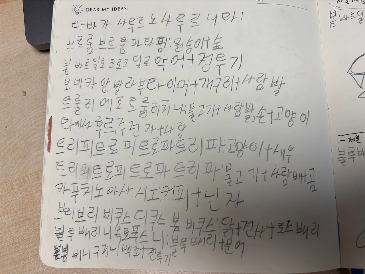 무분별하게 그 유행에 편승하기보다 트렌드를 놀이로 활용하기 위해 몇가지 방법을 사용해보았습니다. 캐릭터를 외워야한다며 쭉 적어내려가는 아들에게, 나중에 그 이름만 보면 누가 누군지 헷갈릴 수 있으니 생김새의 포인트 몇개를 적어놓자고 하거나, ‘한번쯤 마주치고 싶은 캐릭터’ ‘가장 셀 것 같은 캐릭터’ ‘가장 약해보이는 캐릭터’ 등 캐릭터를 보면서 분석하고 파악해보는 놀이를 함께 해주었어요.