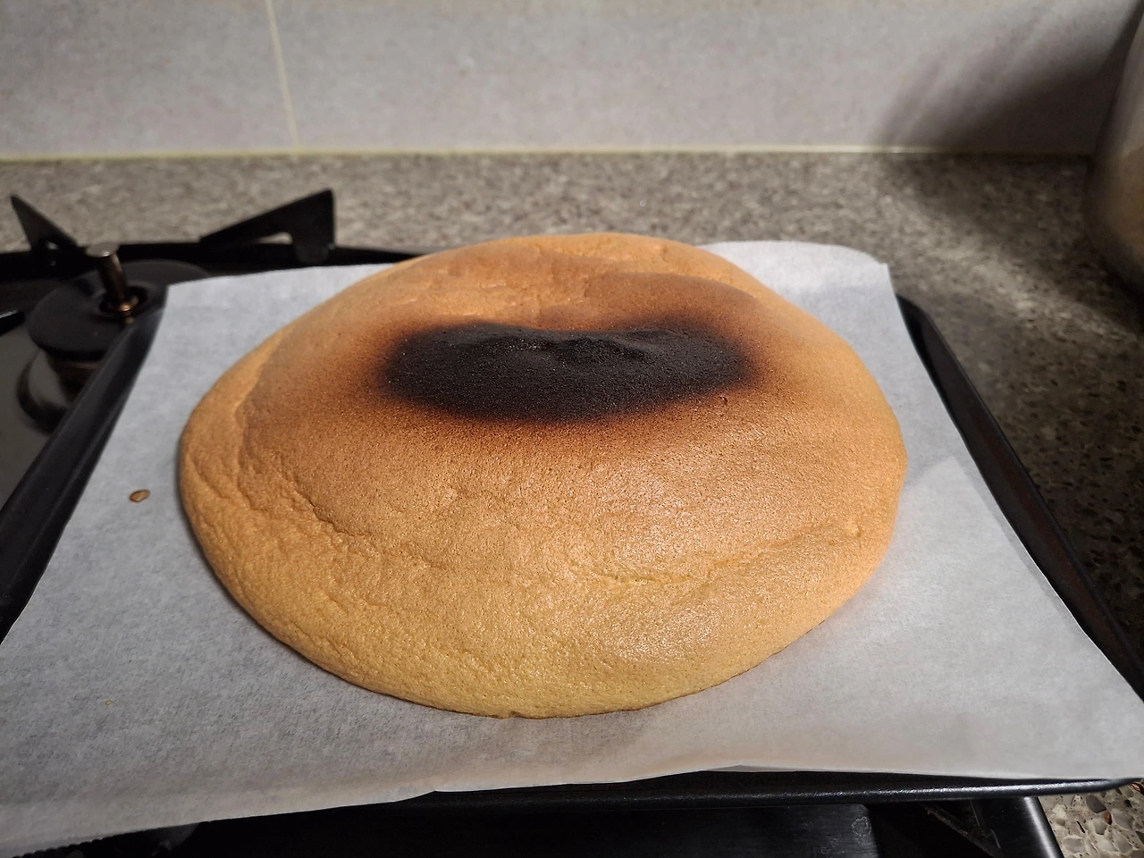 4. 완성. 맛있게 먹는다, 그러나 오븐 높이가 낮은 관계로 이번에도 카스테라 윗부분이 타버리고 말았다.