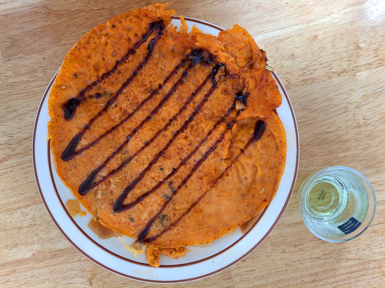 김치전 위에 검은 것은 탄 것도 간장도 아닙니다. 취향존중해 주세요, 데리야끼 소스입니다. (1순위인 마요네즈가 다 떨어졌어요)