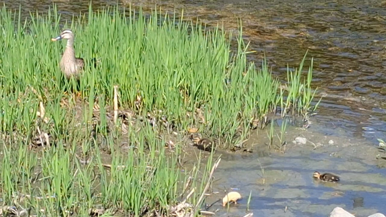 따스한 봄, 엄마오리가 알에서 깬 아기오리들을 데리고 소풍을 온 것 같습니다. 엄마오리는 풀 사이에 숨어서 주변을 살피기 바쁩니다. 아기오리들은 헤엄치랴 풀 뜯으랴 엄마는 안중에 없어 보입니다.