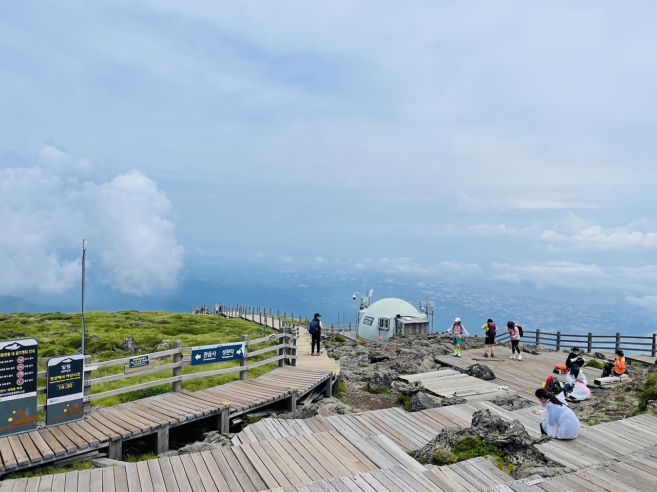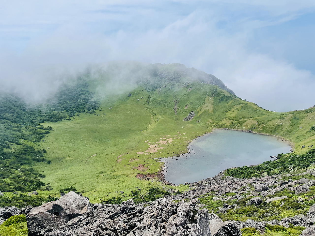 그렇게 백록담에 도착하니 조카는 이미 도착하여 간식을 먹고 있었고, 눈앞에 구름들로 백록담을 전혀 볼 수 없었다. 우리는 낙담하여 아들이 도착할 때까지 기다릴 수밖에 없었는데, 사람들도 백록담을 볼 수 없어서 아쉬워하며 하산을 했다.