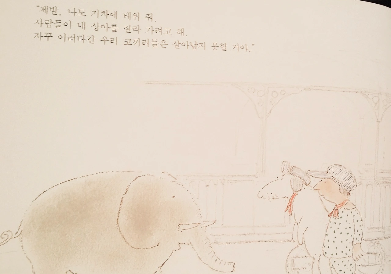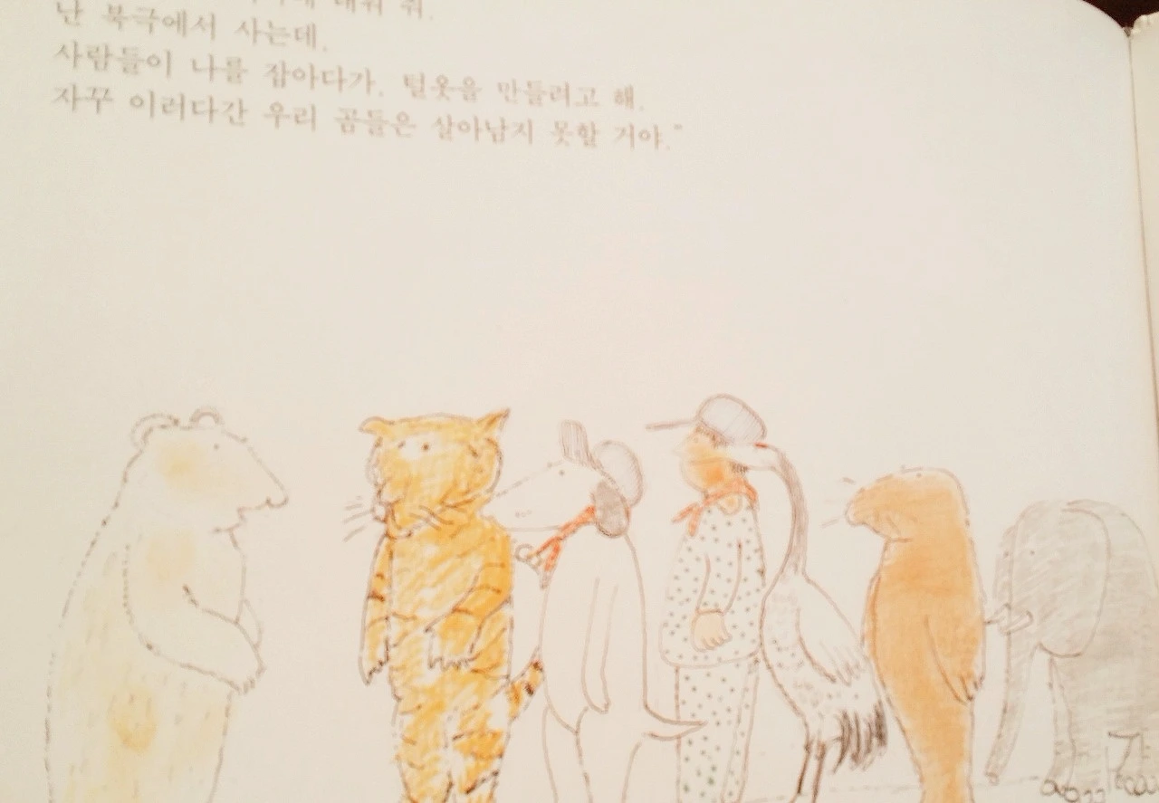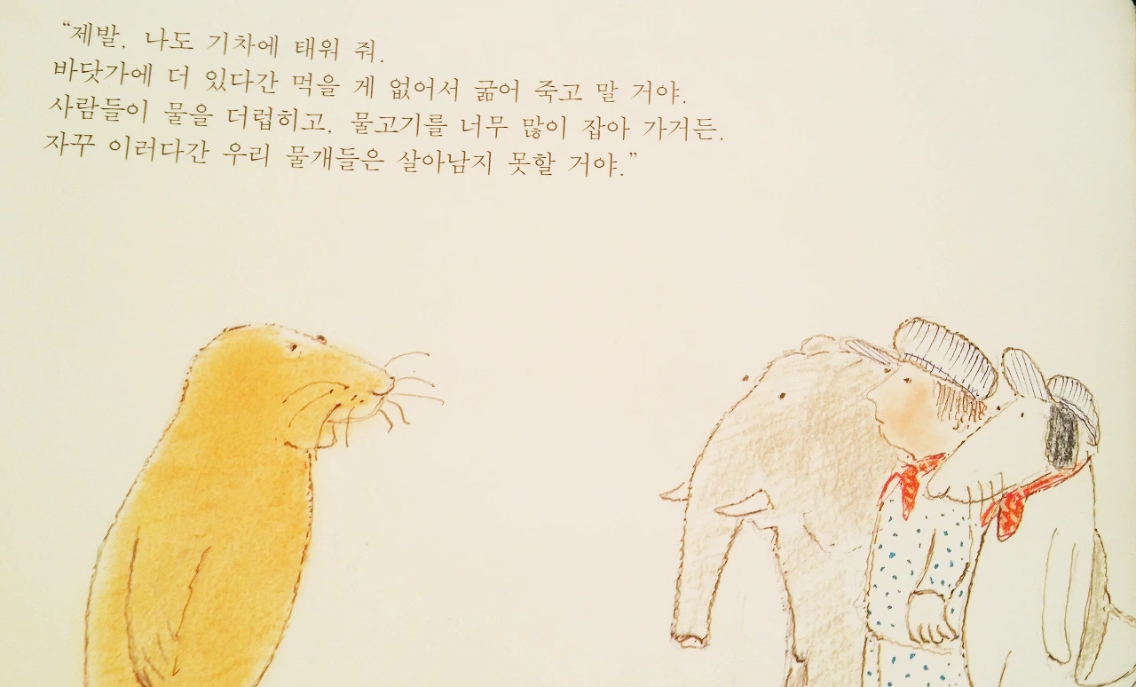 그런데 코끼리는 상아를 잘라가는 사람들 때문에 이곳에 있어야 한다고 말한다. 그러자 아이는 코끼리랑 물놀이를 한다. 어, 물개도 있네?