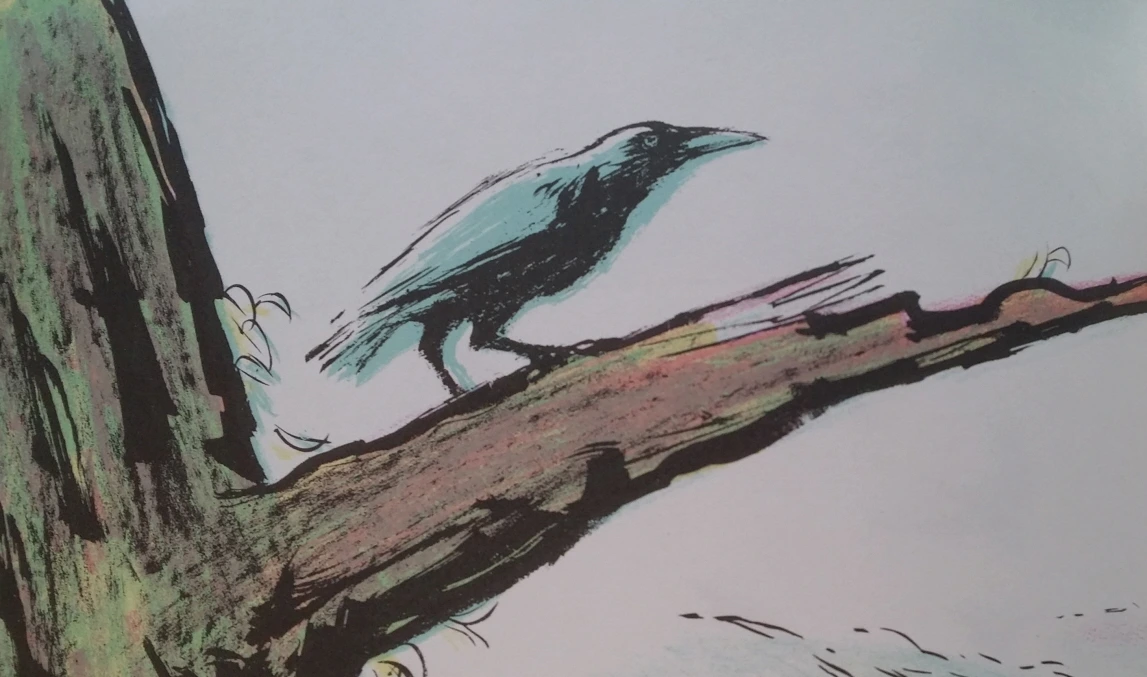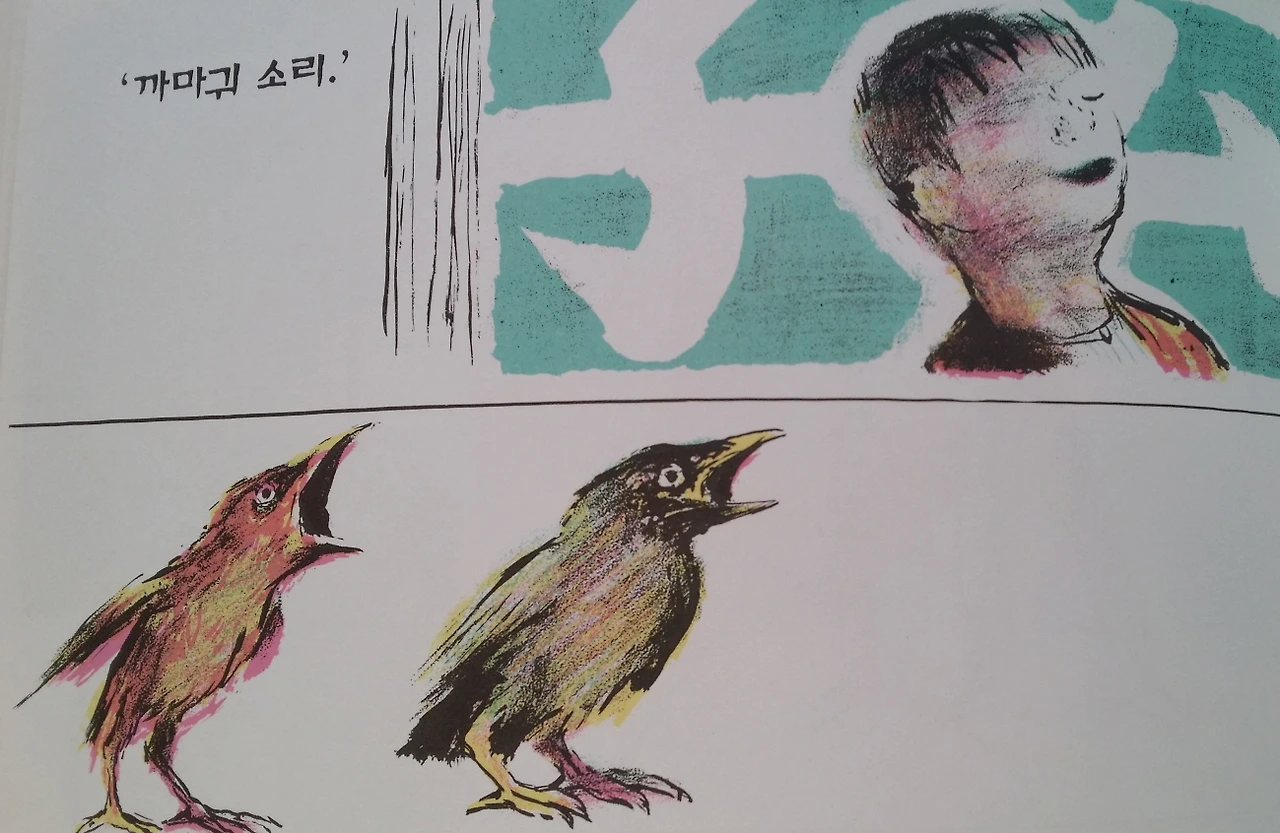 맨 처음에 아이는 알에서 갓 깨나온 새끼 까마귀 소리를 흉내냈다. 그 다음엔 엄마 까마귀 소리, 아빠 까마귀 소리도 냈다. 이른 아침에 우는 까마귀들 소리, 마을 사람들에게 좋지 않은 일이 생겼을 때 까마귀들이 어떻게 우는지 들려주었다. 까마귀들이 즐겁고 행복할 때 어떤지도 들려주었다.