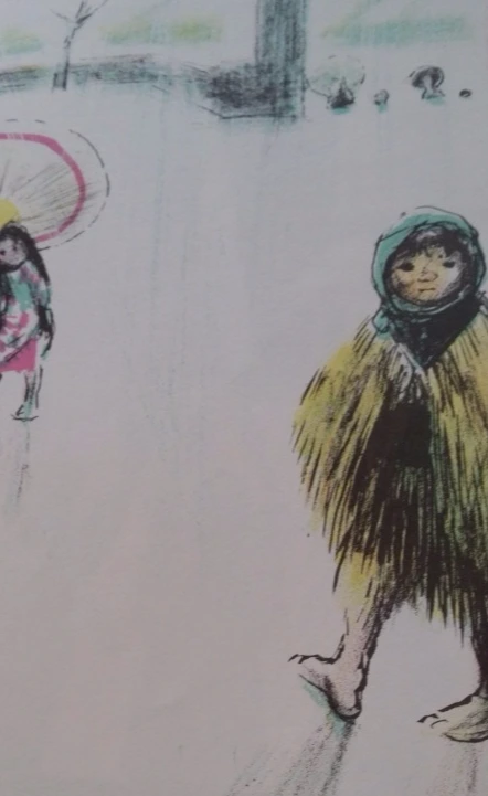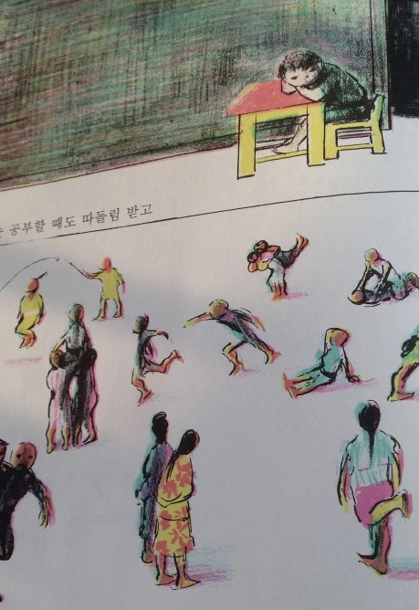 아이는 학교에서 시간 보내며 심심풀이할 방법들을 궁리했다. 책상의 나뭇결을 골똘히 살피거나 창밖을 보았다. 운동장에서 눈을 감고 귀를 기울였다. 그 아이는 아이들이 모두 바보 멍청이라고 놀렸지만 날마다 타박타박 걸어서 학교에 왔다. 비가 오거나 태풍이 부는 날에는 도롱이를 몸에 두르고 걸어다녔다.
