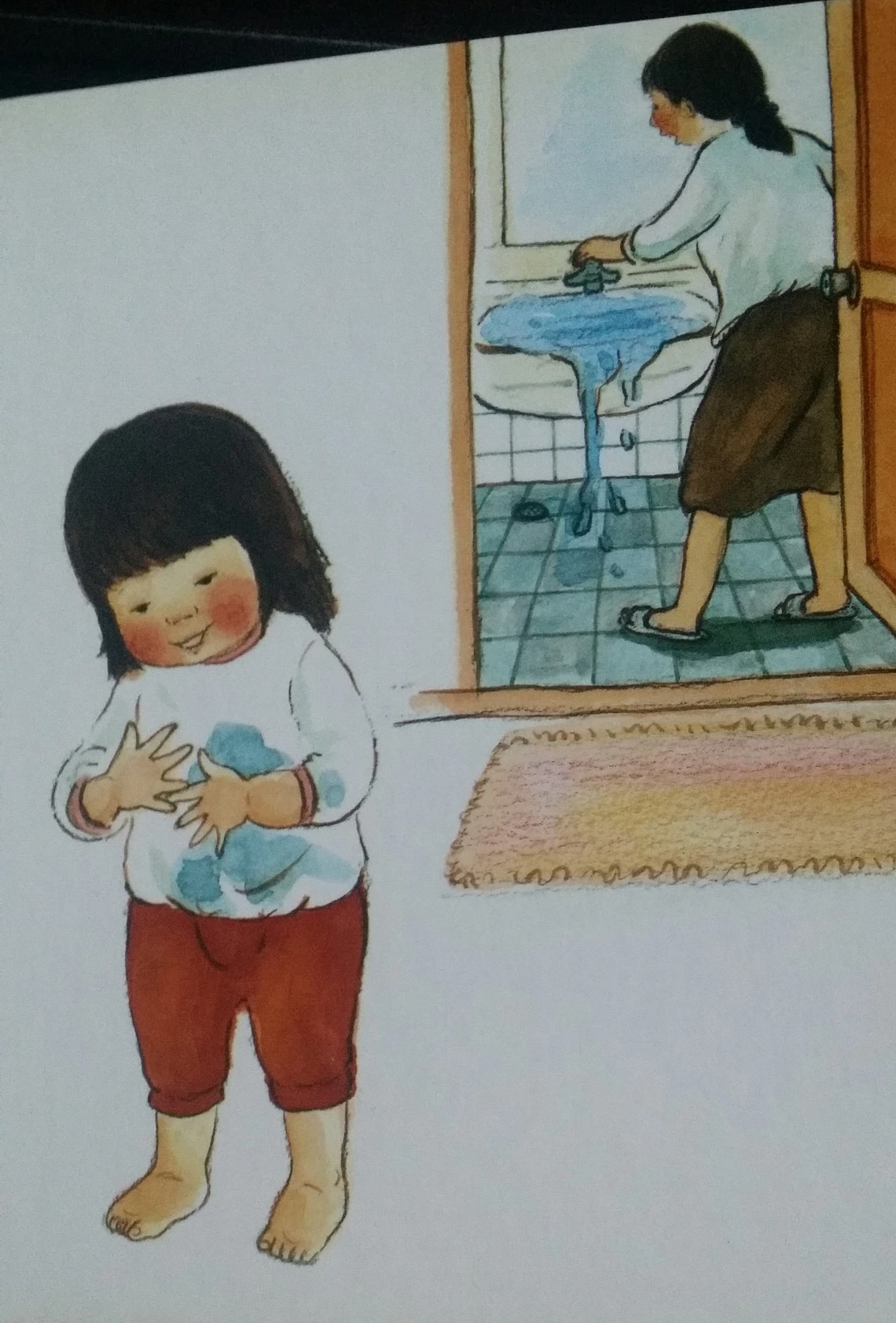 그렇지만 어느새 엄마가 아이가 흘린 것을 치우고 세면대 수도꼭지를 닫는다. 그리고 아이가 "나 혼자 했어요."했을 때 따스하게 안아준다. 아이가 한뼘 자란 행동을 하면 어머니들은 뿌듯함을 느낀다. 작품 속 엄마는 아이를 있는 그대로 인정하고 격려하는 것이다.
