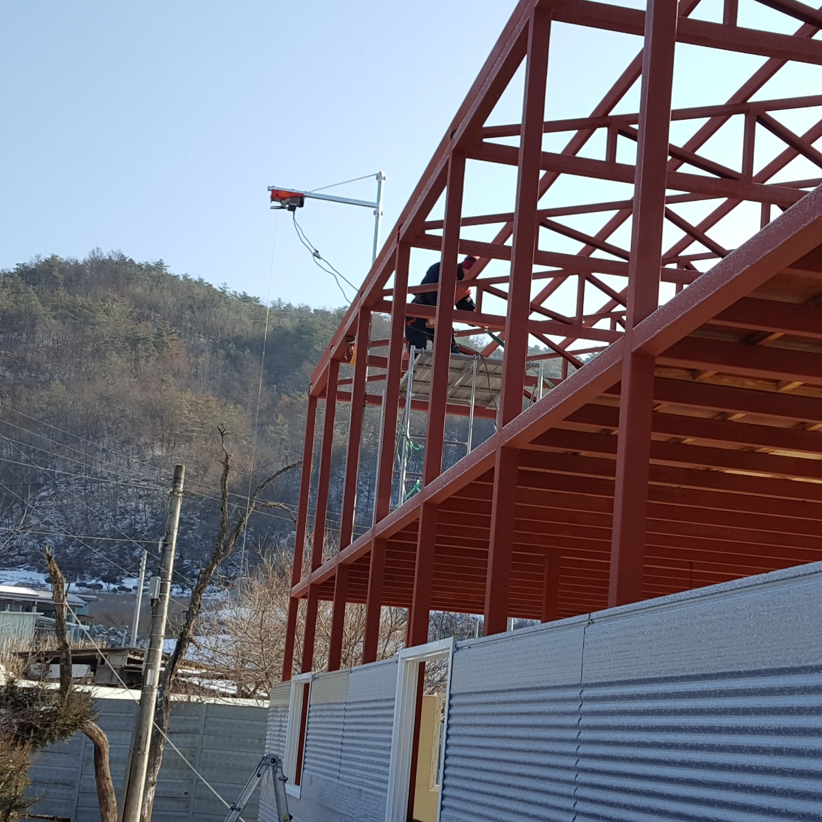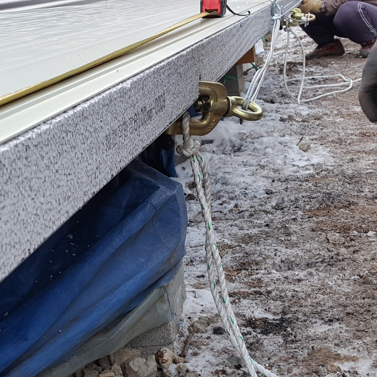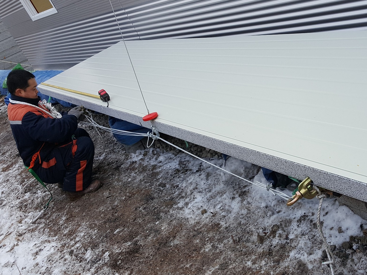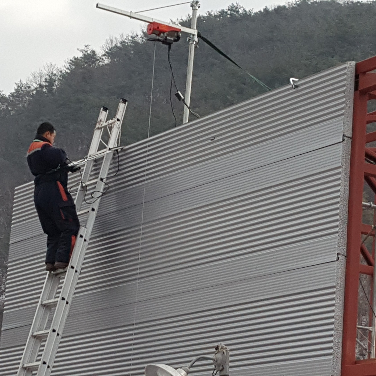 우선은 전동윈치를 패널이 설치될 위치의 중앙부에 설치하는데 골조상부 도리의 높이 보다 최소 1.5m 이상의 높이에 설치를 해야만 마지막에 설치할 패널을 지정된 위치까지 끌어올릴 수 있다.