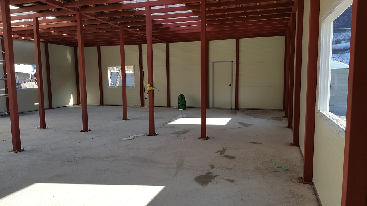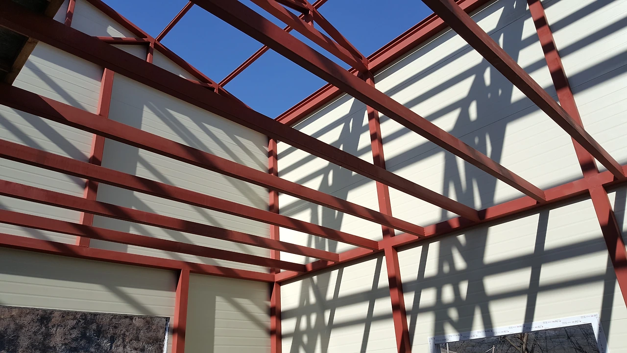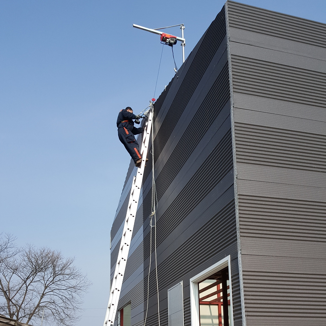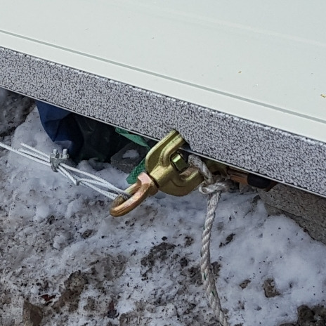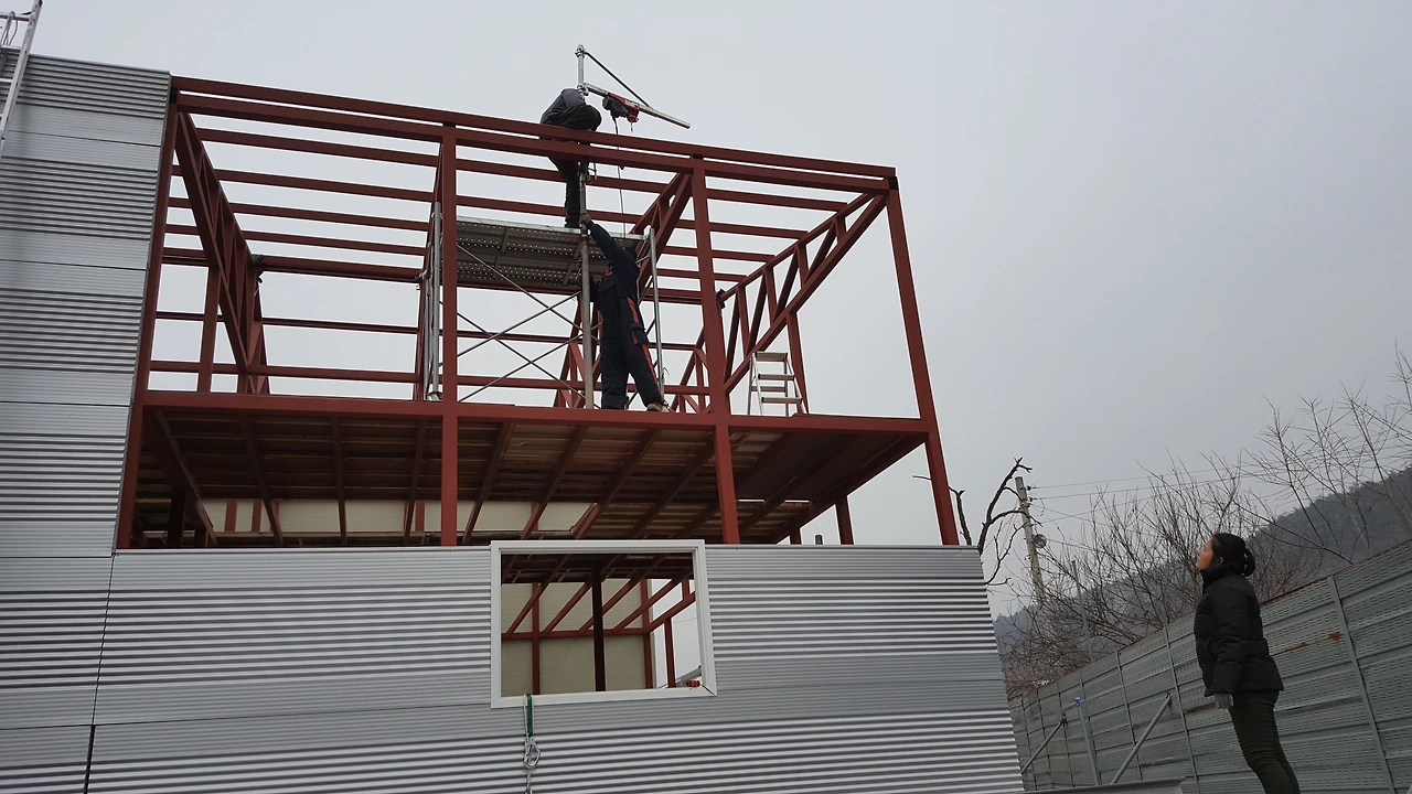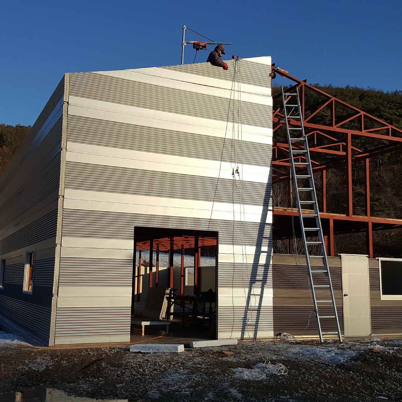 우선은 전동윈치를 패널이 설치될 위치의 중앙부에 설치하는데 골조상부 도리의 높이 보다 최소 1.5m 이상의 높이에 설치를 해야만 마지막에 설치할 패널을 지정된 위치까지 끌어올릴 수 있다.
