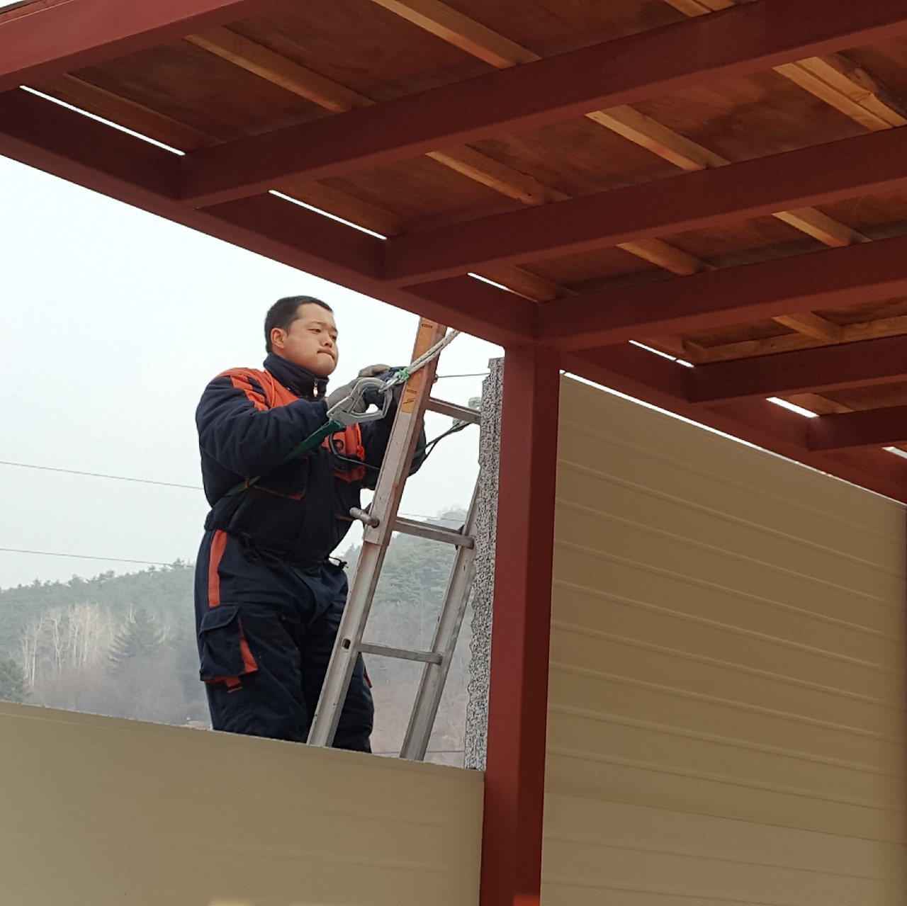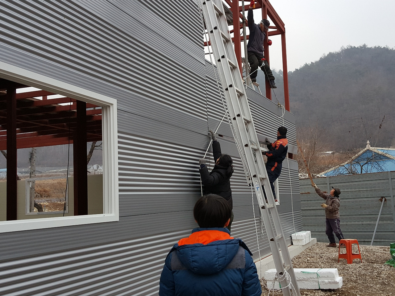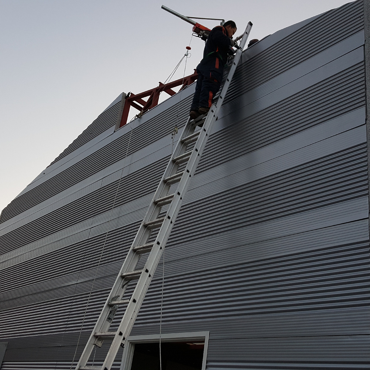 이제 나는 고소작업 안전띠를 착용하고 사다리를 타고 올라가 직결나사로 패널을 뚫고 지나가 기둥 각관을 뚫고 들어가면서 패널을 고정시킨다.