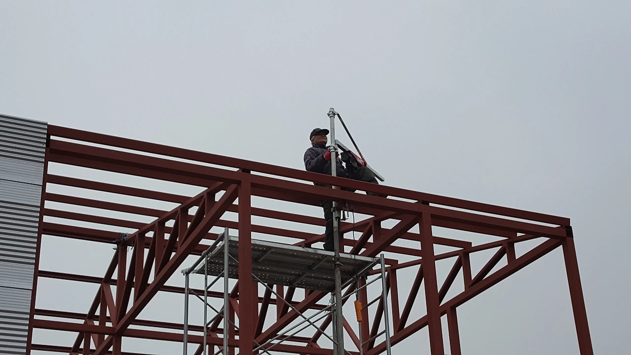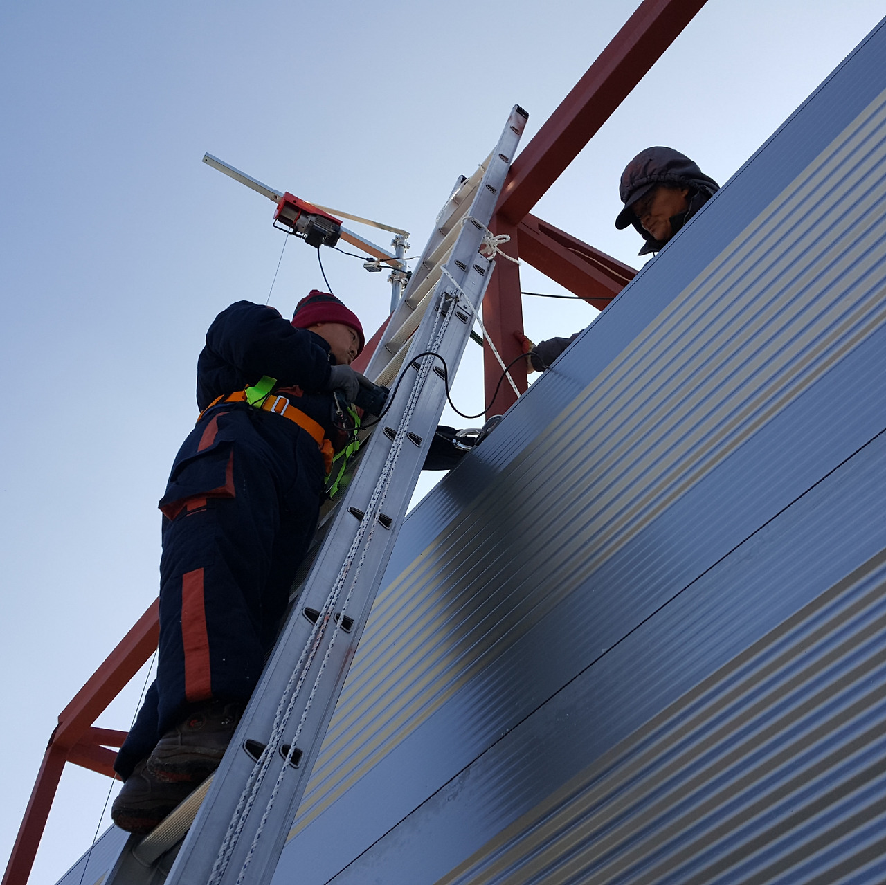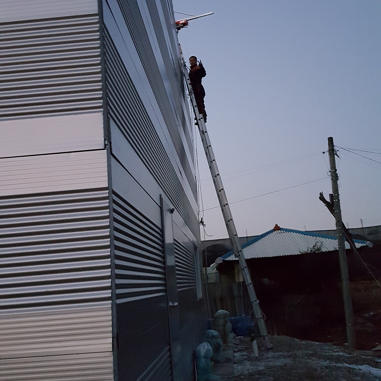 이제 나는 고소작업 안전띠를 착용하고 사다리를 타고 올라가 직결나사로 패널을 뚫고 지나가 기둥 각관을 뚫고 들어가면서 패널을 고정시킨다.
