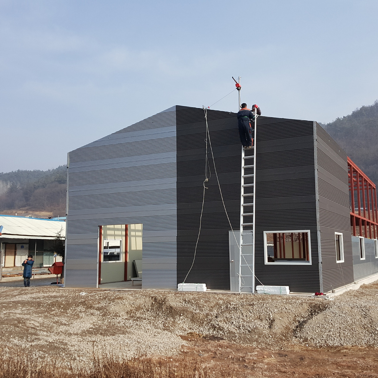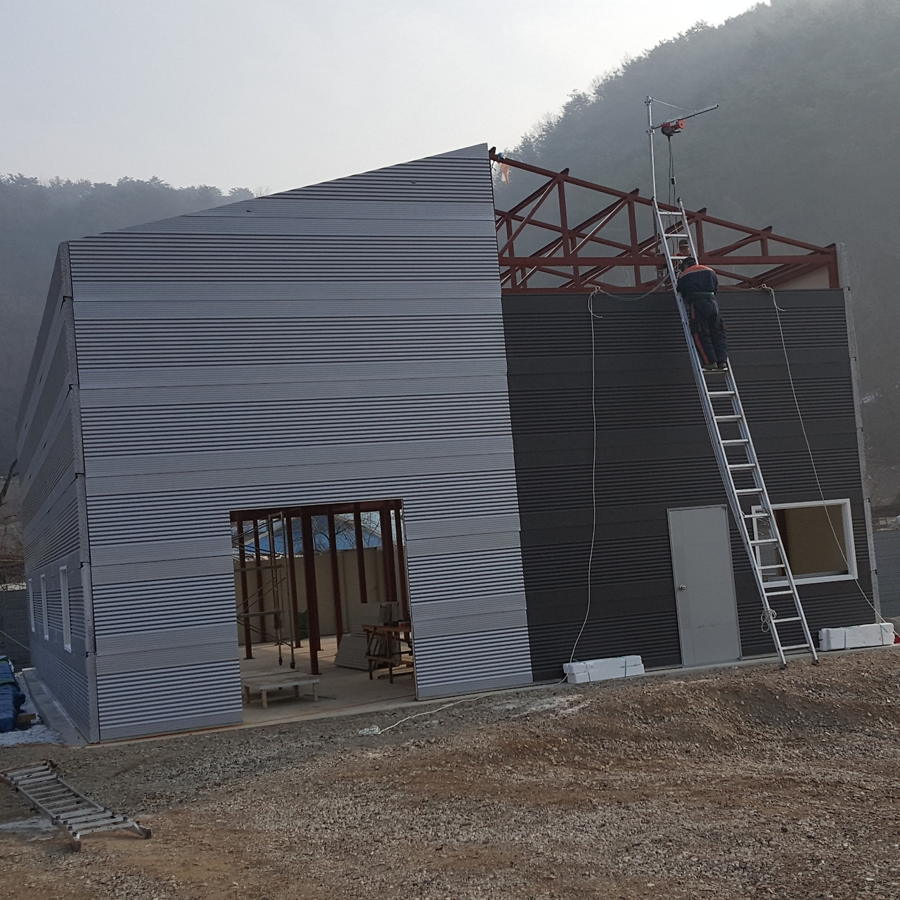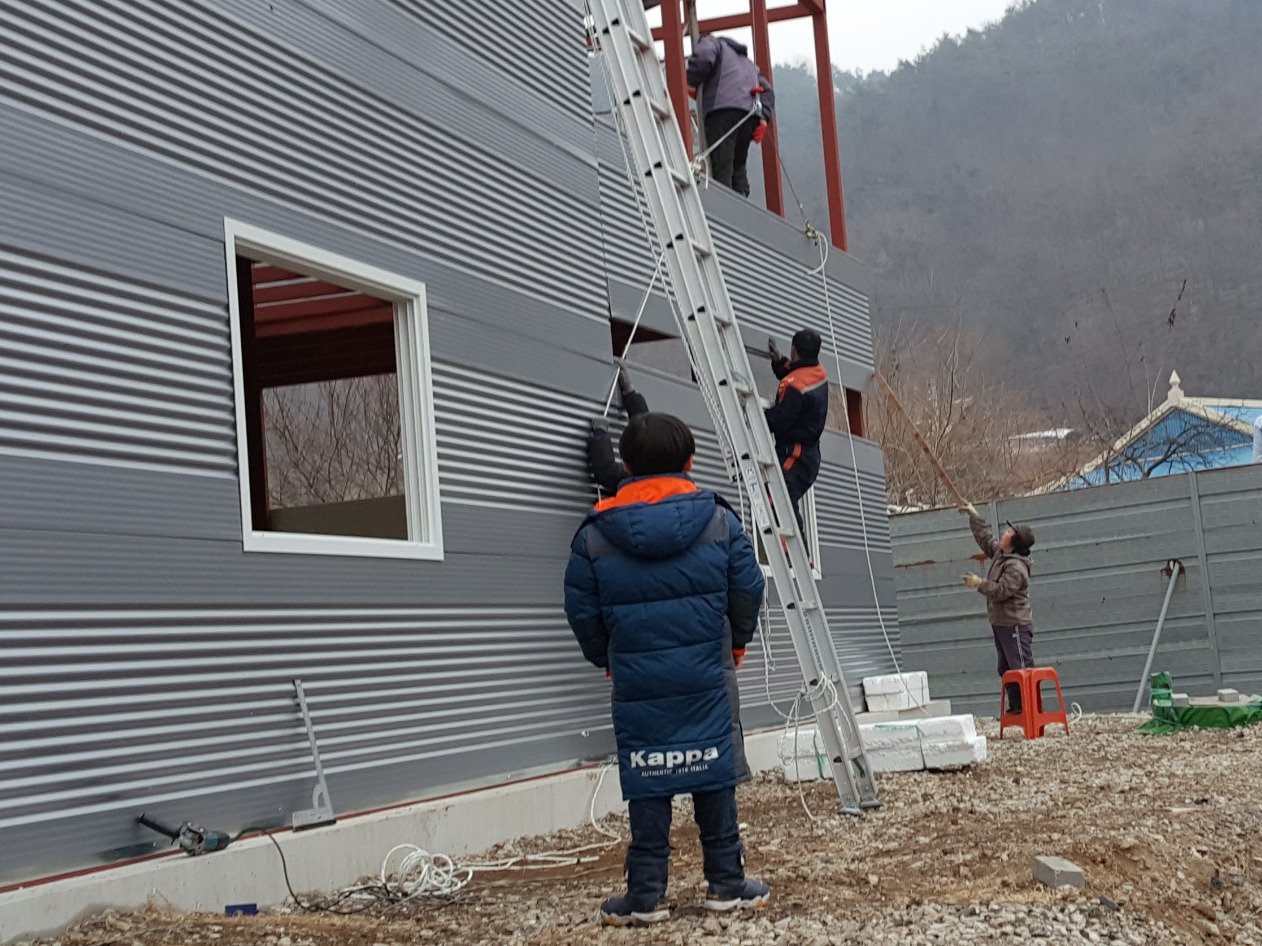 건물의 외벽 중 전면과 후면은 직각사각형의 형태여서 벽면 최상단의 패널 사이즈 측정과 절단이 비교적 쉬웠다. 양옆면의 상단 부분은 박공형태여서 직각삼각형으로 절단하여 작업을 해야 하는데사전에 CAD프로그램으로 정확한 치수를 얻었지만 역시 현장은 컴퓨터 속 그림 그리기와 다르다.