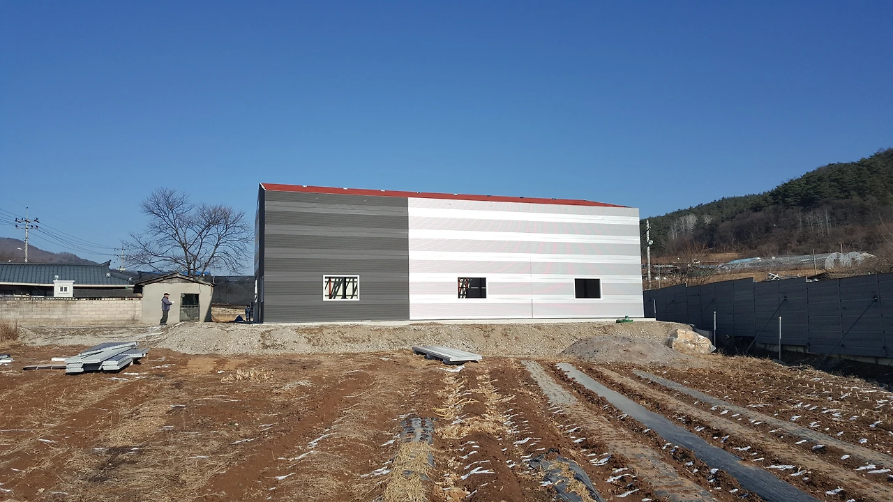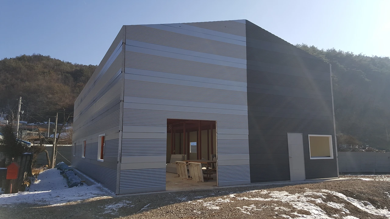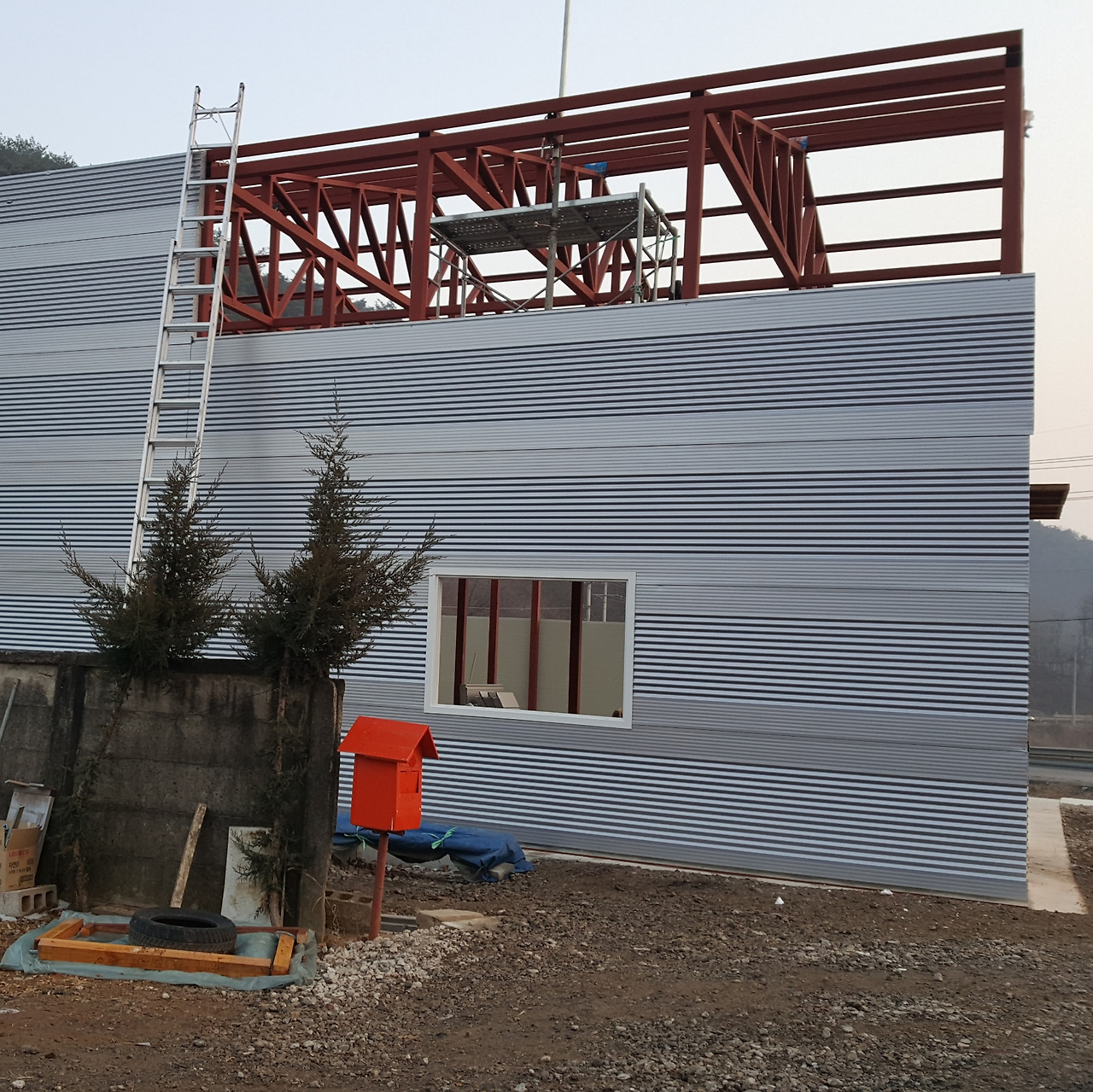 건물의 외벽 중 전면과 후면은 직각사각형의 형태여서 벽면 최상단의 패널 사이즈 측정과 절단이 비교적 쉬웠다. 양옆면의 상단 부분은 박공형태여서 직각삼각형으로 절단하여 작업을 해야 하는데사전에 CAD프로그램으로 정확한 치수를 얻었지만 역시 현장은 컴퓨터 속 그림 그리기와 다르다.
