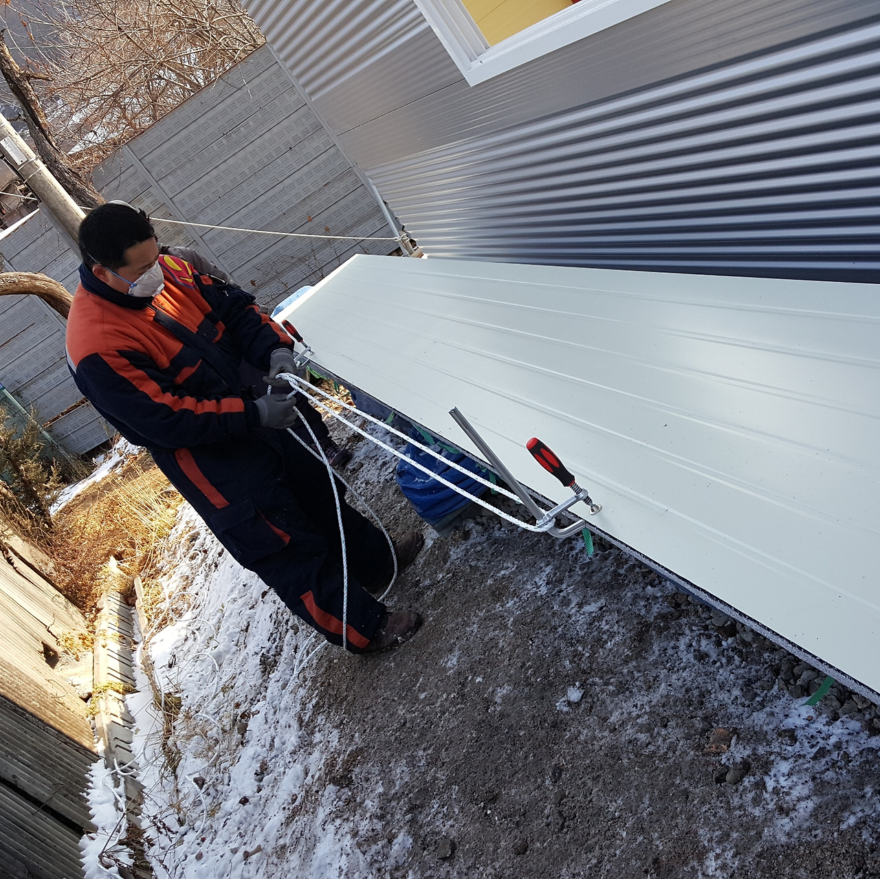 그러한 이유로 패널을 들어 올릴 때 양쪽 끝을 밧줄로 묶어 좌우로 돌아가거나 한쪽으로 치우치지 않도록 균형 있게 밧줄을 당겨 잡아 주어야 한다. 그리고 패널이 올라갈 때 1단 2단 벽패널에 닿아 손상이 가는 것을 막을 수 있다.