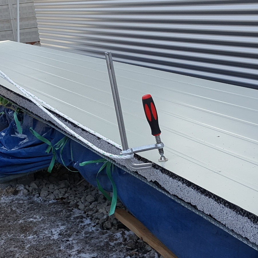 패널클램프 제작자는 아마도 많은 경험과 노하우가 있는 사람이라 생각이 든다. 본인의 시공 노하우를 도구로 만든 것 같다. 패널의 함석(철판) 부분의 밴딩(철판을 휘다) 구조에 맞게 패널클램프의 서포트(철판을 잡는 부분) 모양이 잘 잡을 수 있도록 굴곡지게 만들어져 있어 한번 클램핑(조이다) 하면 절대 빠지지 않을 구조로 만들어져 있다. 패널클램프 만드신 분이 정말 존경스럽다. 덕분에 우리는 큰 수고를 덜었다.