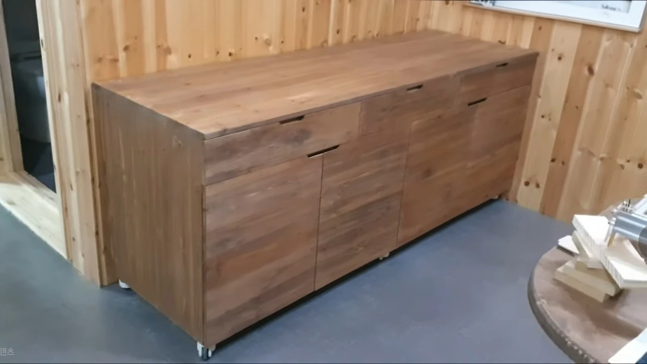 각종 서류와 생활에 필요한 잔구류를 정리할 수납장이 필요했다. 서랍형과 여닫이형을 합쳐 활용도를 높여 제작했다. 지금은 형태가 바뀌어 업무 테이블 겸 수납장으로 활용하는데 정말 유용하게 사용하고 있다.