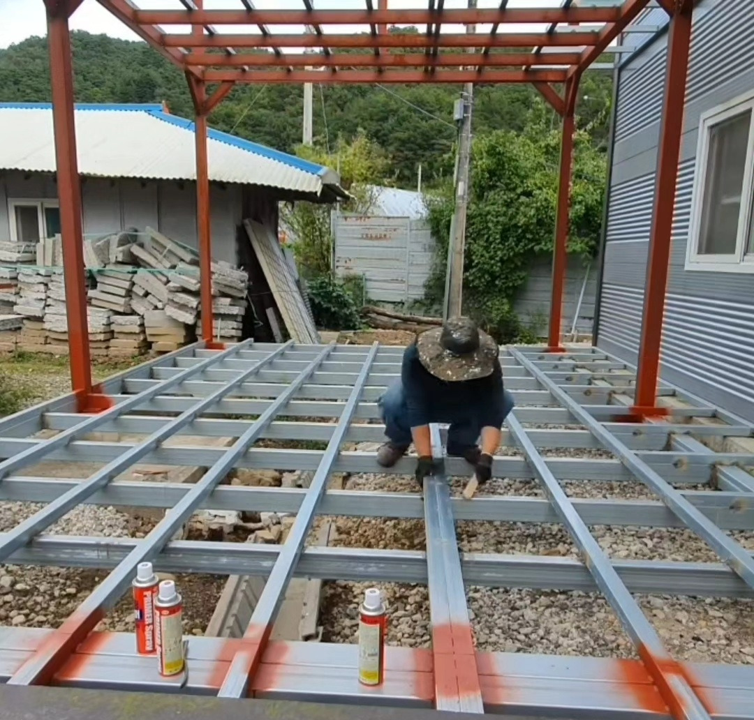이제 발 디딜 곳을 튼튼하게 지지해 주는 '바닥장선' 작업을 할 차례이다. 보는 위에서 가해지는 하중을 양쪽 기둥이나 벽으로 전달해 주는 수평 구조 부재이다. 그 우리 애 바닥장선을 설치하게 되는데 바닥장선은 바닥판을 받쳐주는 수평구조 부재로서, 하중을 보로 전달하는 중강 지지 재라 말할 수 있다.