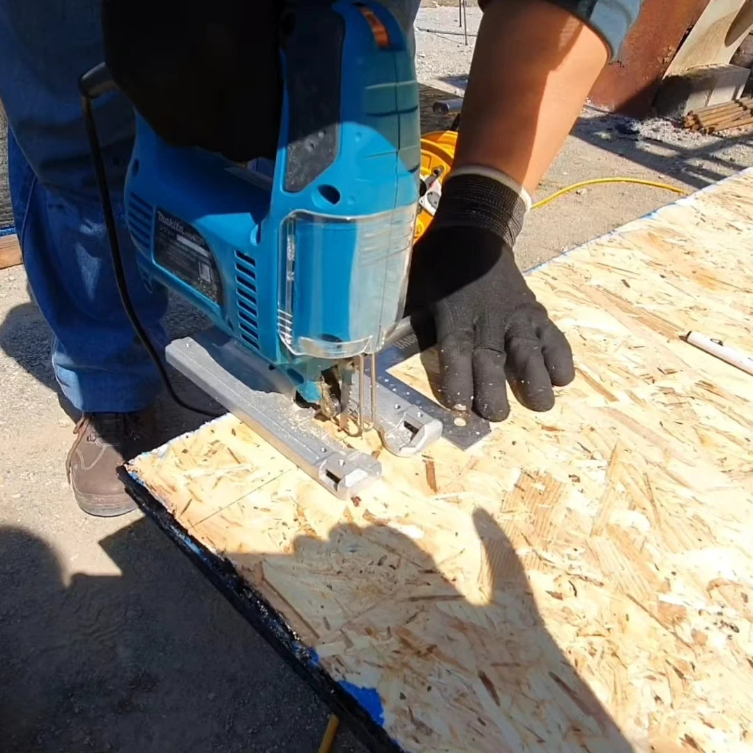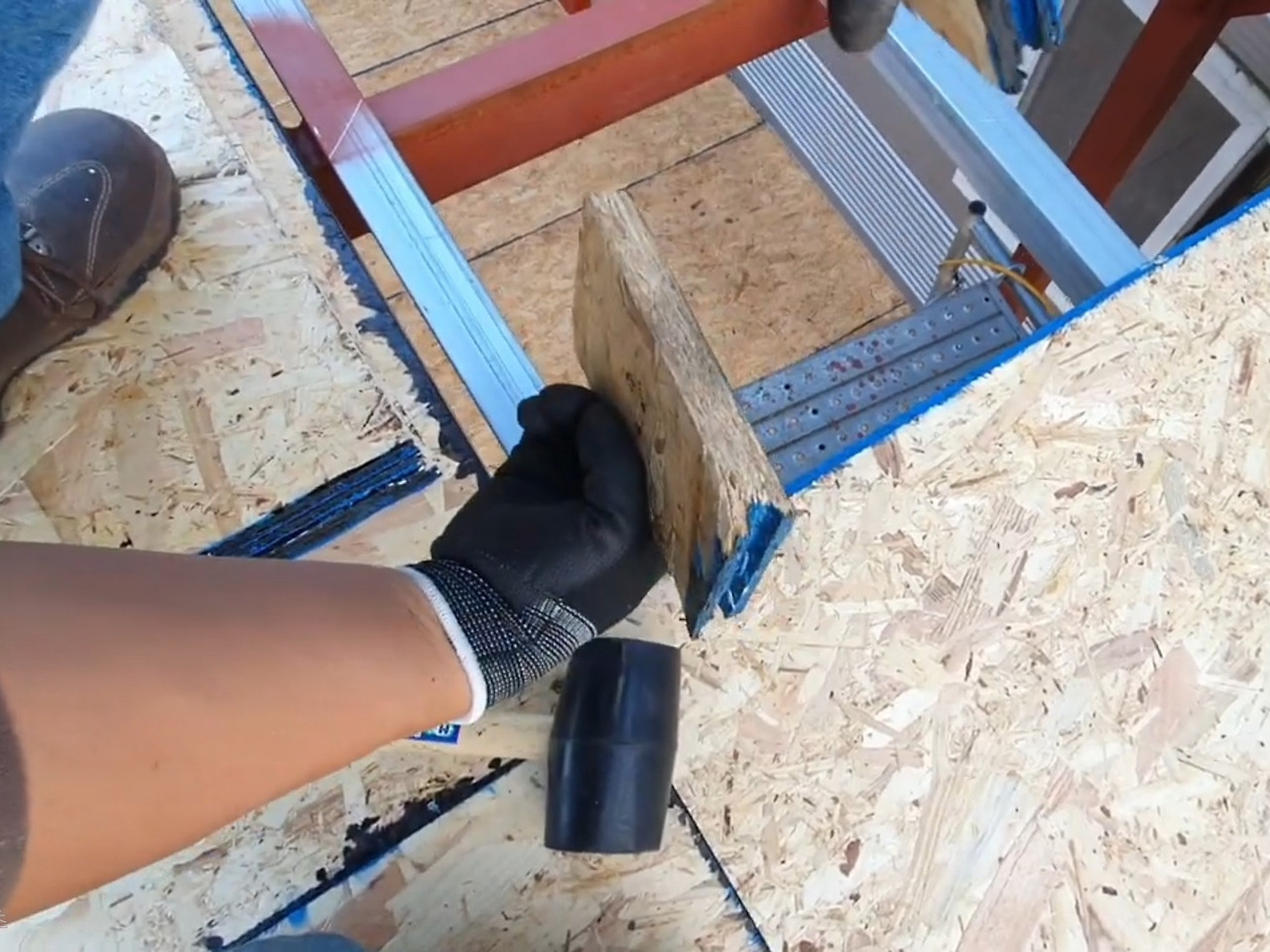 OSB 합판을 끼울 때는 대충 밀어 넣으면 오와 열이 틀어져 판이 뒤틀리기 쉽다. 그래서 Tongue 부분을 잘라 만든 보조 블록을 끼운 뒤, 고무망치로 두드려 틈새 없이 견고하게 연결해야 한다. 그래야 Groove 부분이 파손되지 않고, 합판도 단단히 맞물린다.