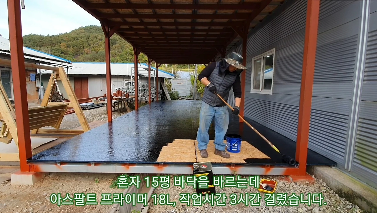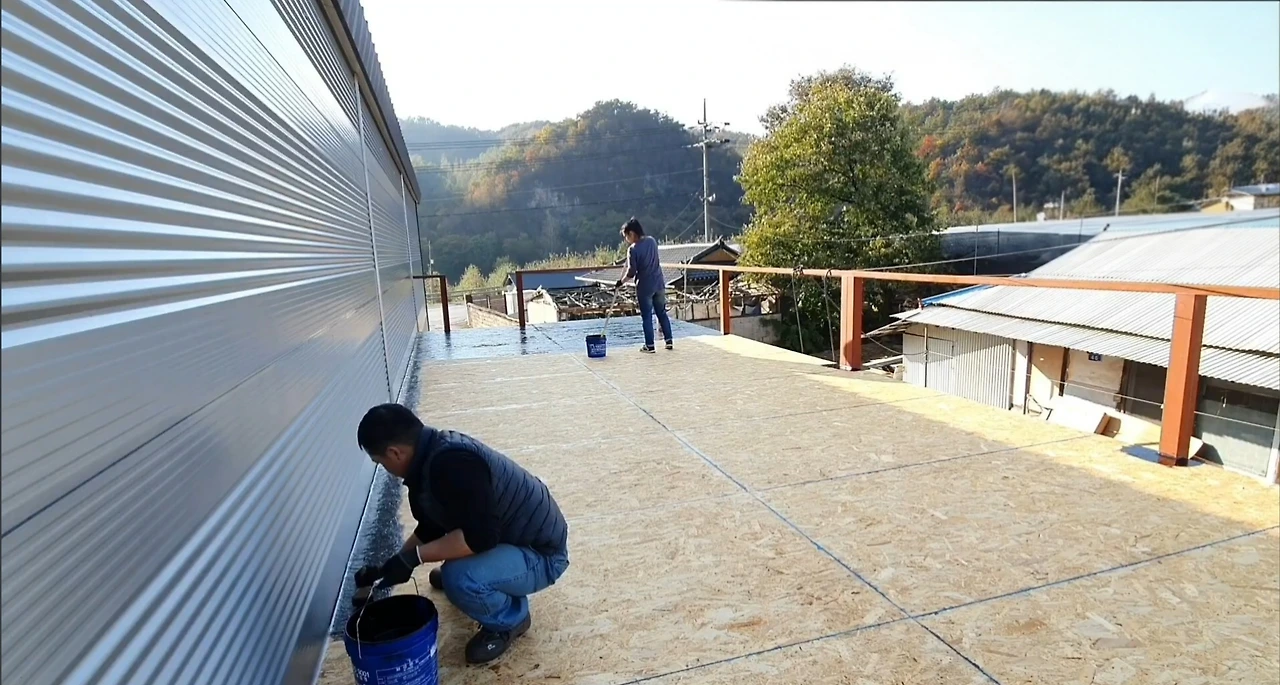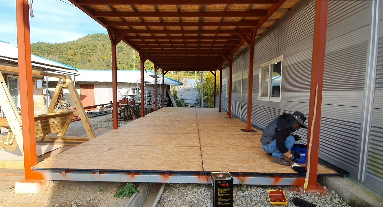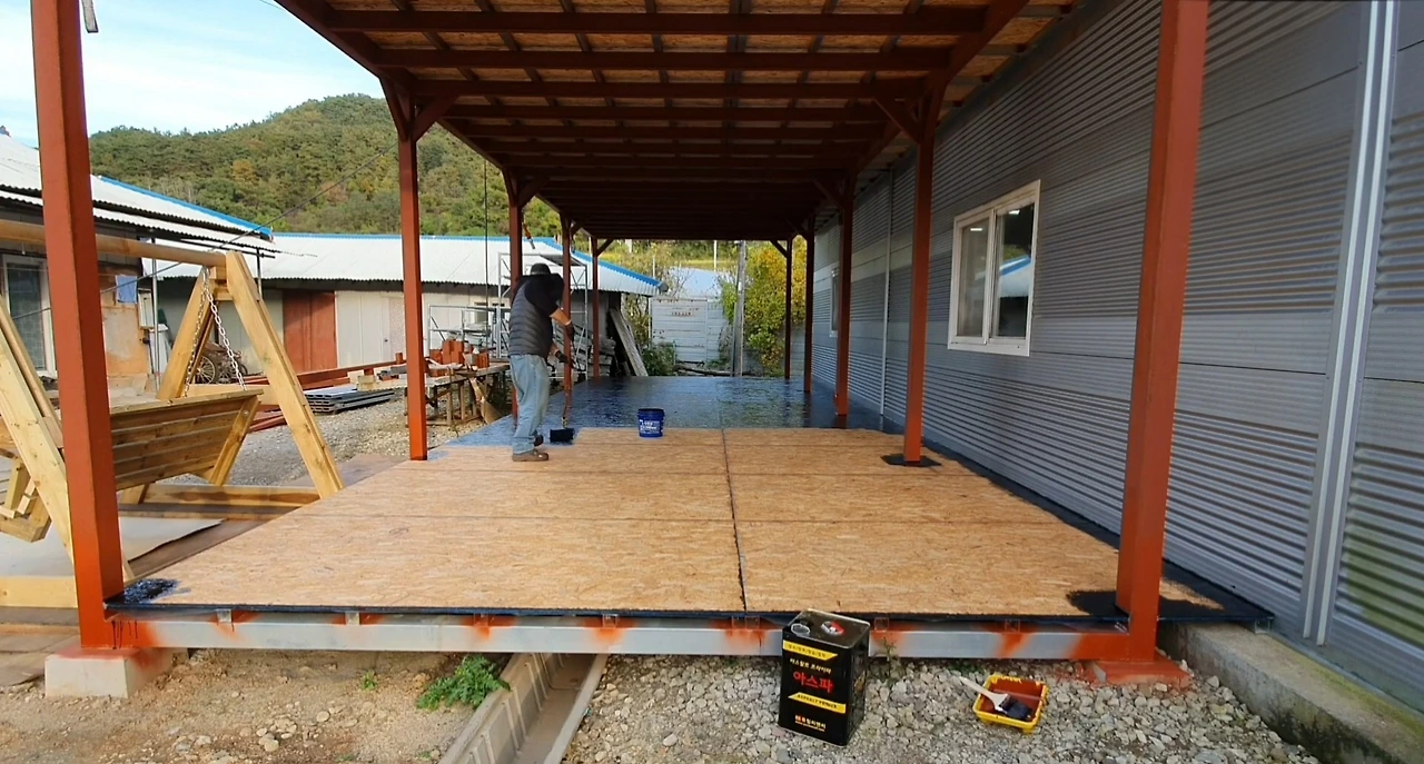 OSB 합판도 마찬가지다. 제조 과정에서 접착제와 압착으로 강도를 키웠지만, 기본적으로는 나무다. 그래서 바닥재로 사용할 때 반드시 방수 작업을 해야 한다.