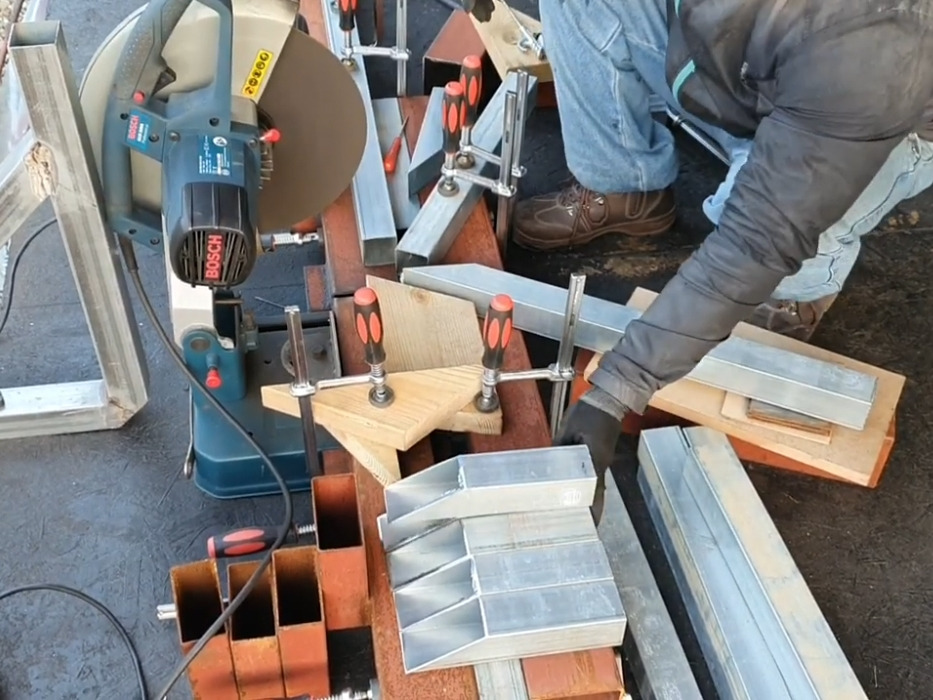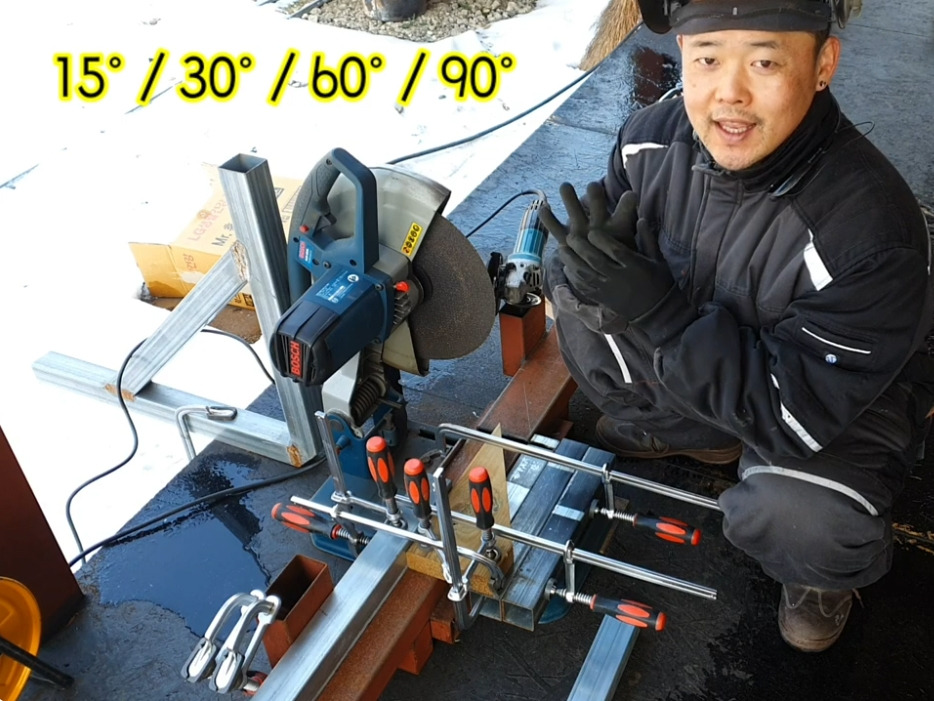 나는 지그를 만들고 클램프로 강하게 고정한 뒤, Two in One 컷팅이 가능하도록 세팅했다. 예를 들어 90도/30도, 90도/60도, 90도/15도 컷팅을 동시에 반복할 수 있도록.