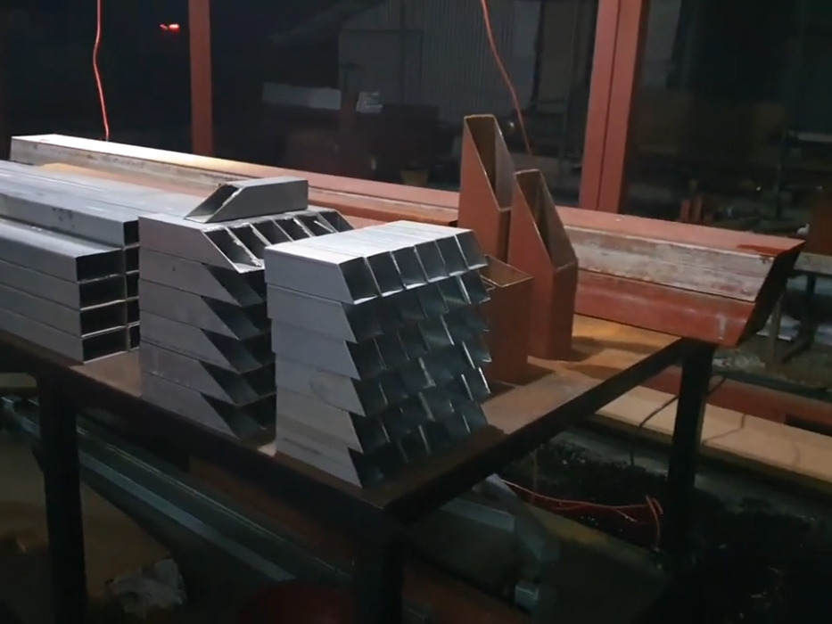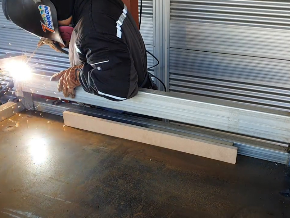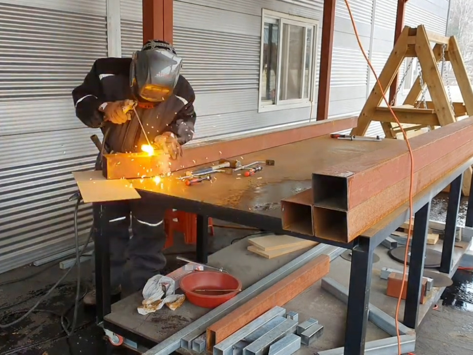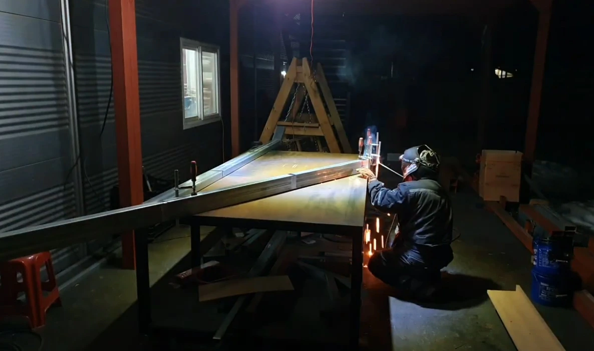 다음은 옥상에서 아래층까지 이어질 긴 보. 긴 보를 정확한 각도와 길이로 컷팅하고, 여러 조각을 용접해 길게 이어 두 개의 큰 뼈대를 만들었다.