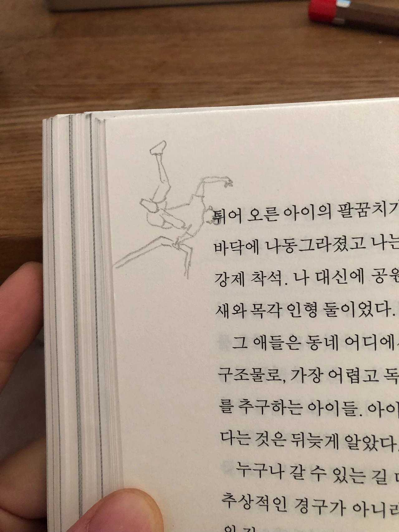 읽는 내내 없는 솜씨로 책 귀퉁이에 그림을 그려 넣는 나를 발견했다. 산책하는 소설이라더니. 이건 비행이다. 상상력의 비행! 우리가 언젠가 꼬리의 꼬리의 꼬리의 꼬리를 물고 다다랐을 동심의 세계를 작가는 너무도 당연하다는 듯 지금 우리의 나이로 옮겨오고 있다. 그러니까 동화 같다고 해야겠지. 이상한 나라의 앨리스의 앨리스처럼 내 몸은 집 한 채만 해졌다가, 쥐구멍만 해졌다가. 하지만 이런 동화에도 결말은 있기 마련이다. 멀리, 아주 머얼리 날아온 것 같은데 착지해 주변을 둘러보면 결국 제자리다. 어쩔 수 없이 돌아와야만 하는 회귀 본능처럼. 그래서 슬픈 마음이 드는 거겠지. "삶에서 우리를 슬프게 할 수 있는 것은 결국 우리가 마음을 쏟았던 것들이니까."