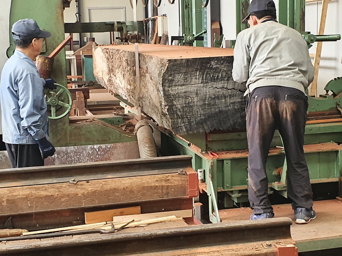 부빙가(Bubinga) 원목을 제재하는 제재부 기술자들