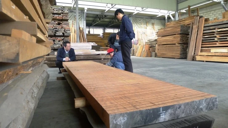 구상해온 목제품 제작에 알맞은 부빙가(Bubinga) 숙성 건조재를 고르는 모습