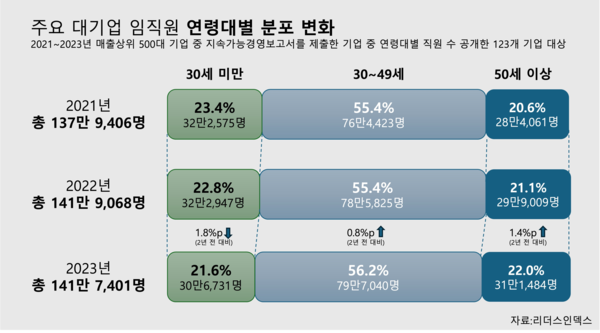 주요 대기업 임직원 연령대별 분포 변화 (이미지 = 리더스인덱스)