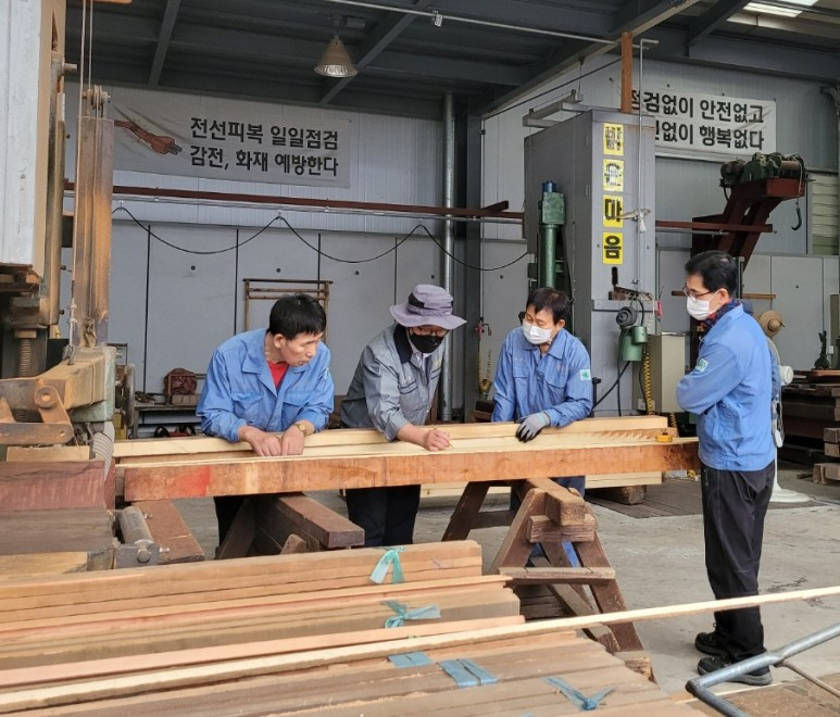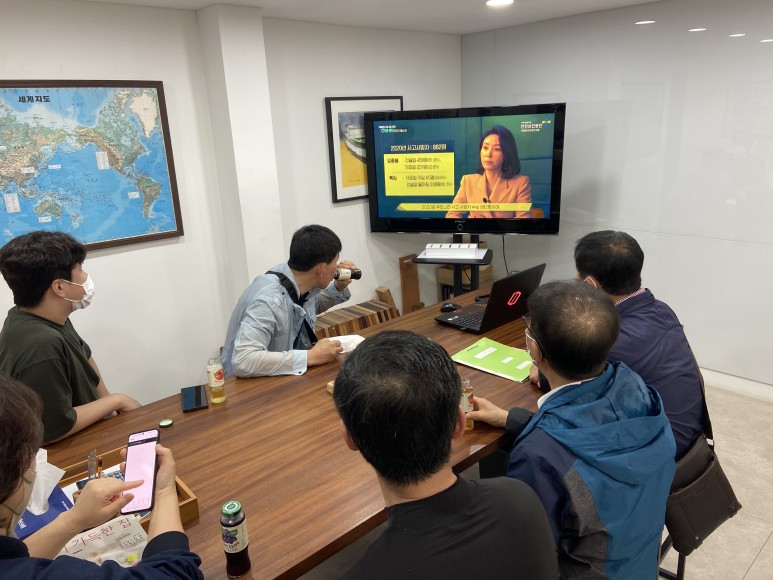 사내교육 시간에 영상물을 시청하는 공장 식구들
