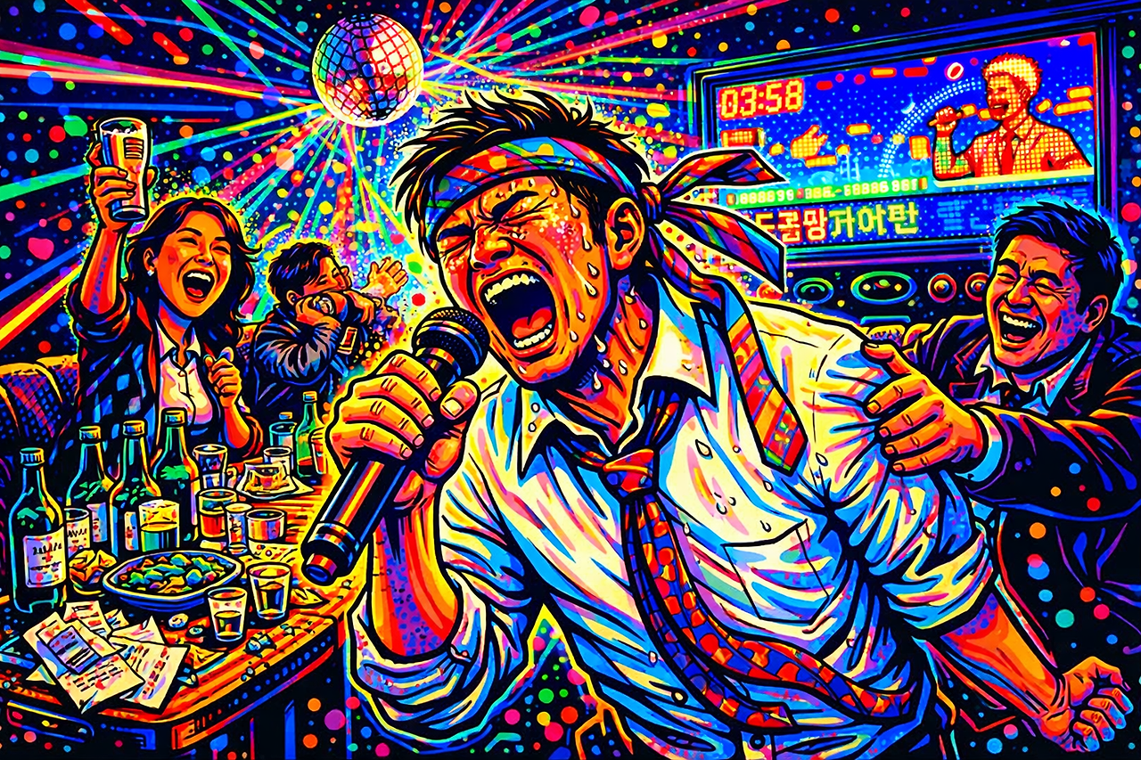 특히 이 무렵의 회식을 떠올리면 폭탄주 문화가 빠지지 않는다. 맥주잔 속에 소주를 가득 채운 소주잔을 떨궈 단숨에 들이켜는 방식은 빨리 취하고 빨리 분위기를 끌어올리는 데 익숙한 시대의 속도감과도 닮아 있었다. 서열의 벽을 잠시 흐리는 것처럼 보였지만, 실제로는 그 서열을 다른 방식으로 확인하는 시간이기도 했다. 넥타이를 머리에 매고 노래방에서 마이크를 잡던 장면은 우스운 추억처럼 남아 있지만, 지금 돌아보면 그 시대 화이트칼라 회식의 피로와 압박이 한데 응축된 모습에 더 가깝다.