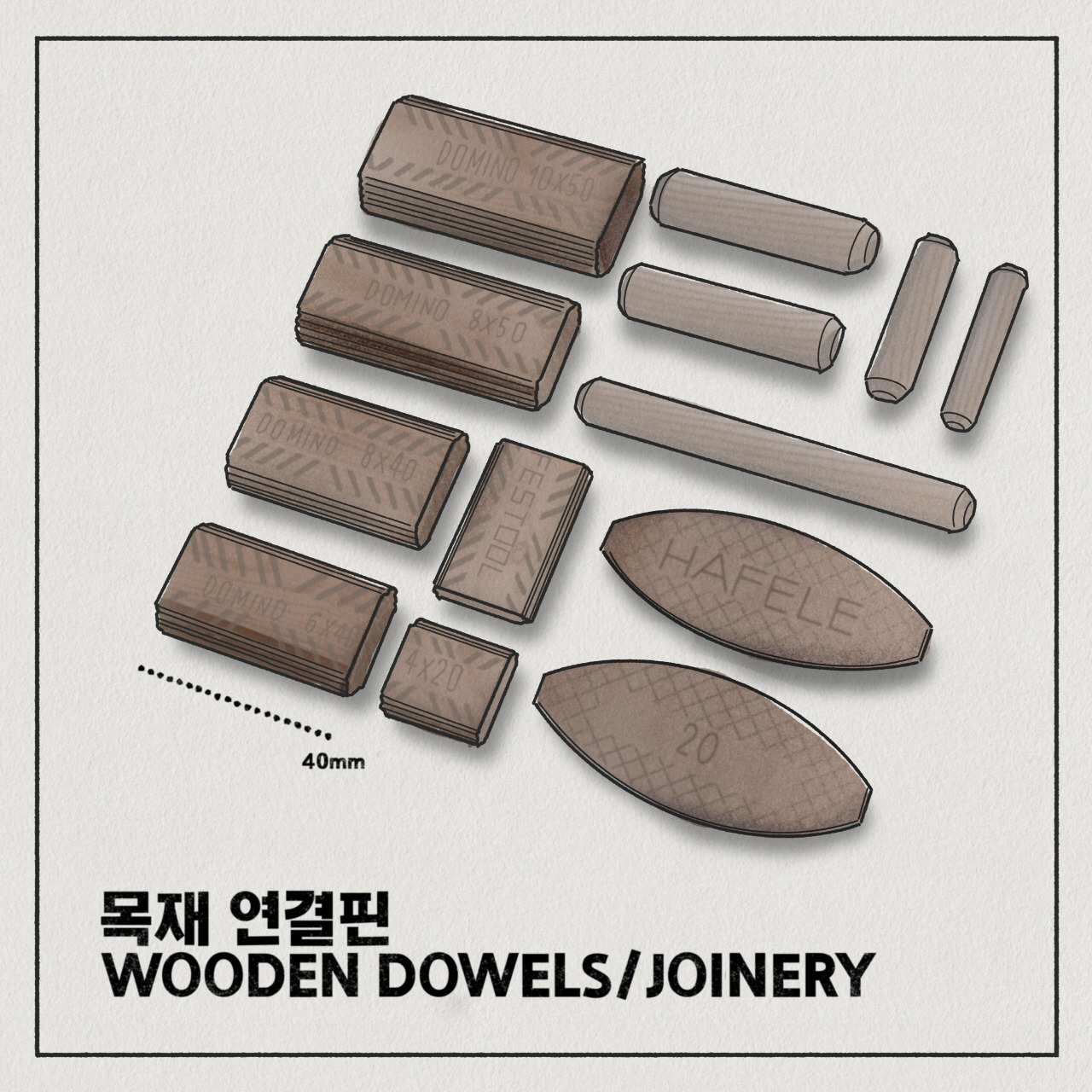 오른쪽 위의 작은 목봉들은 도웰(dowel)이다. 흔히 목심이나 목다보라고 부른다. 가장 단순한 형태의 경제적인 연결방식이다. 단면이 6, 8, 10mm 등의 지름을 가진 원형이므로 전용 기계 없이 전동드릴만으로 딱 맞는 홈을 파낼 수 있다. 도미노나 비스킷과는 달리 원형의 특성상 360도 어느 방향으로나 끼워 넣을 수 있기에, 정위치에 결합하기 위해서는 두 군데 이상 도웰을 사용하거나 세심하게 위치를 잡아 고정해줘야 한다. 도웰은 목재를 결합할 때보다 나사못 구멍을 감추는 용도로 더 자주 사용된다. 나사머리를 깊이 박아 넣은 뒤 생긴 구멍에 접착제를 바른 도웰을 끼워서 막는 방식이다. 튀어나온 부분을 플러그톱으로 잘라내고 사포질로 정돈해 주면 깔끔하게 마무리된다.