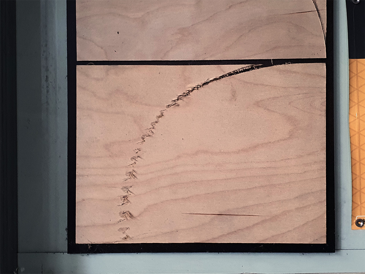 두 번 연속으로 킥백을 맞은 적이 있다. 나에게 있었던 거의 유일한 사고이다. 주문이 밀려 서둘러 작업을 이어가던 중이었다. 이렇게 작업하면 사고 나도 할 말 없겠군, 이라고 생각하는 순간 재단 중이던 얇은 합판이 휘면서 톱날을 타고 올라가 내 아랫배를 스쳤다. 역시 그렇군, 이라고 생각하며 새 합판으로 다시 작업을 시작하자마자 같은 방식으로 배를 강타당했다. 두 번째 타격지점은 부어오른 상태로 단단하게 굳고 피멍이 들어 한 달 넘게 나를 조롱했다. 그때 사고를 일으키고 뜯겨버린 부재 두 개는 액자로 만들어 눈에 잘 보이는 곳에 걸어두었다.