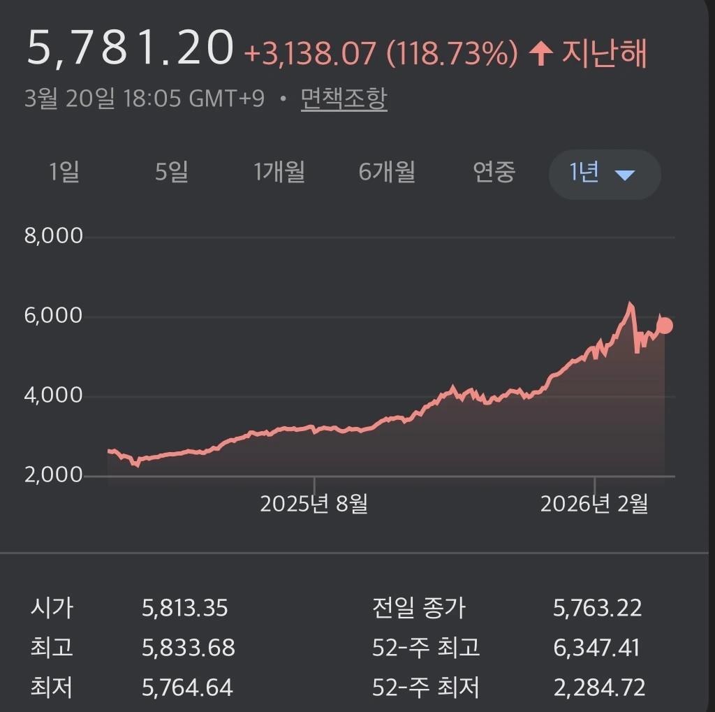 코스피는 6000을 터치하고 5000대를 유지 중이다. 상승률 세계 1위다. 미장을 찬양하던 신봉자들은 이제 신용을 끌어다 국내 대형주를 사들이고 있다. 100조 원이 넘는 돈이 매수대기계좌로 흘러들어왔다. 시장의 마지막 비관론자마저 돌아섰다.