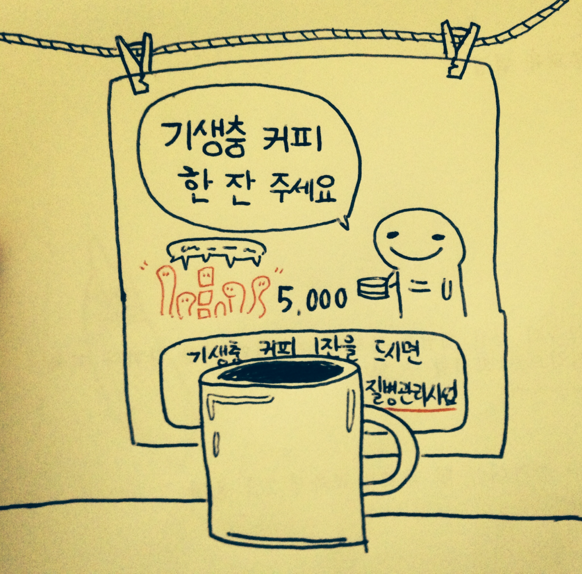 선행의 크기와 유무보다 중요한 것은 좋은 행동을 하려는 의지를 갖는 것과 자신이 할 수 있는 아주 작은 것부터 실천하는 일이 아닐까 싶다. 그리고 사람은 서로가 서로를 돕는 선한 존재라는 사실을 믿는 것 또한 꼭 필요하다. 기생충커피를 마시고 난 후에 나는 저개발 국가의 아동과 국내의 후원자를 연결해주는 NGO에서 일하는 후배에게 연락을 했다. 글을 쓰고 그림을 그리는 내가 무언가 도움을 줄 수 있을까 하는 생각에서였다. 후배는 내가 도울 수 있는 일을 알아보고 연락을 주기로 했다. 나는 여러모로 부족한 사람이지만 누군가를 위한 작은 보탬이 될 수 있으면 좋겠다.
